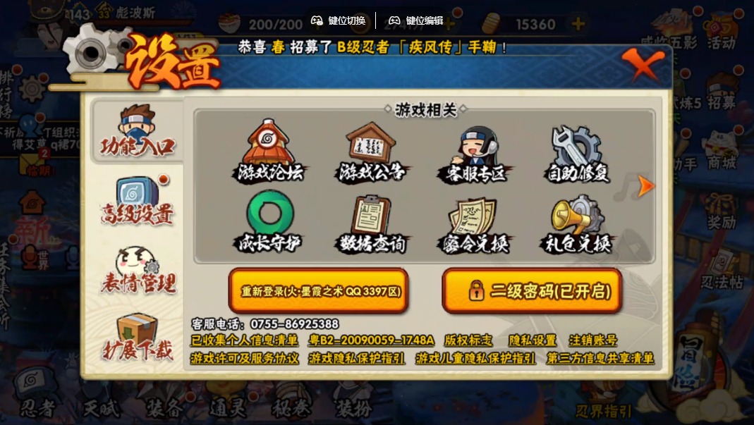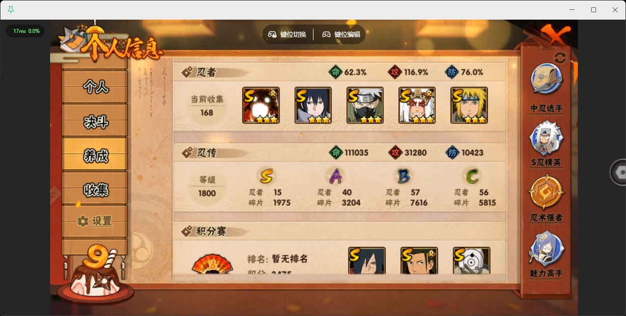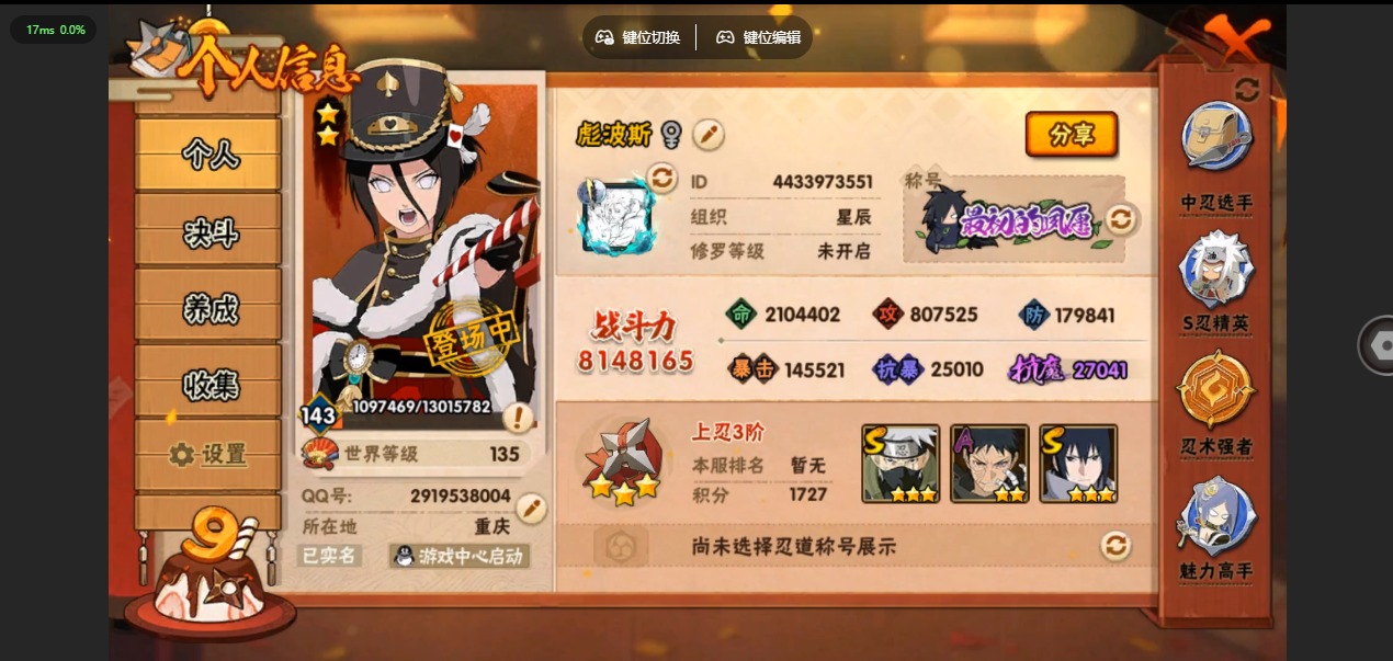 [12266662]V11 15S忍 34A忍 19通灵 814.8W战力 可二次 可修改实名 优质装备:熊猫,波风水门「秽土转生」,“宇智波斑” 「白面具」,神秘面具男 「红夜之刃」,宇智波佐助「永恒万花筒」,千手柱间·木叶创立,宇智波斑「秽土转生·解」,大筒木桃式,艾「忍界大战」,旗木卡卡西「须佐能乎」,大筒木舍人 「最终章」,漩涡鸣人 「暴怒·第六尾」 S级忍者:自来也 「舞之豪杰」,宇智波鼬 「须佐能乎」,佩恩「天道」,波风水门