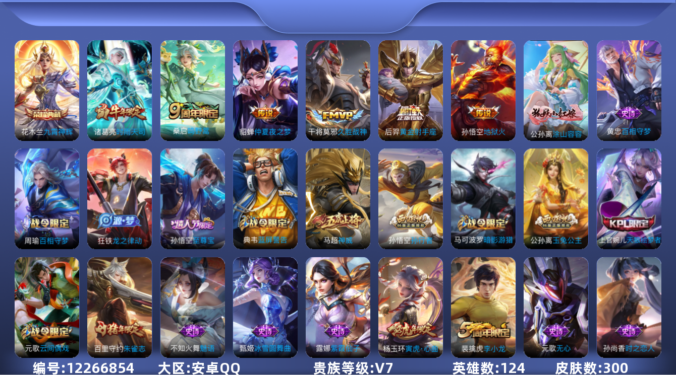 [12266854]V7 1典藏 6传说 124英雄 300皮肤 可修改实名 优质装备:九霄神辉(木兰典藏),黄金射手座,久胜战神,地狱火,仲夏夜之梦(大飞蛾),涂山容容 珍宝阁皮:万物之道,蔷薇恋人,女武神 限定皮:鸣野蒿,至尊宝,时雨天司(水龙头),神威(电光马子),遇见飞天,高山流水,五谷丰年,游园惊梦,梁祝,天狼绘梦者,李小龙,朱雀志(守约年限),孙行者,寅虎·心曲(虎婆),玉兔公主 史诗皮:星界战将,龙之律动,百相守梦-周瑜,蒙犽顽岩魄,百相守梦-黄忠,紫霞仙子,黄金分割率,特工魅影,千年之狐,江河有灵,魅语,蒙恬荣光圣徽,冰冠公主,偶像歌手,电玩·爆裂旋风,暗夜猫娘,龙骑士(小龙虾),猫狗日记-孙策,猫狗日记-大乔,时之恋人-孙尚香,乱世虎臣,节奏热浪,女仆咖啡,摇滚巨星,水果甜心,绅士熊喵,天才门将,星夜王子,心灵骇客,时之奇旅-安琪拉,功夫厨神,德古拉伯爵,暗隐猎兽者,幽灵船长,鬼剑武藏,心灵战警,舞动绿茵,地狱岩魂,纤云弄巧,繁星吟游(呼啦呼啦),拒霜思,缤纷独角兽,乘风破浪,逐浪之夏,水晶猎龙者,曙光守护者,箭羽风息,金属风暴,原初追逐者,圣诞狂欢,圣诞恋歌,鹰眼统帅,魅力维加斯,黎明之约,无心,未来纪元-赵云
