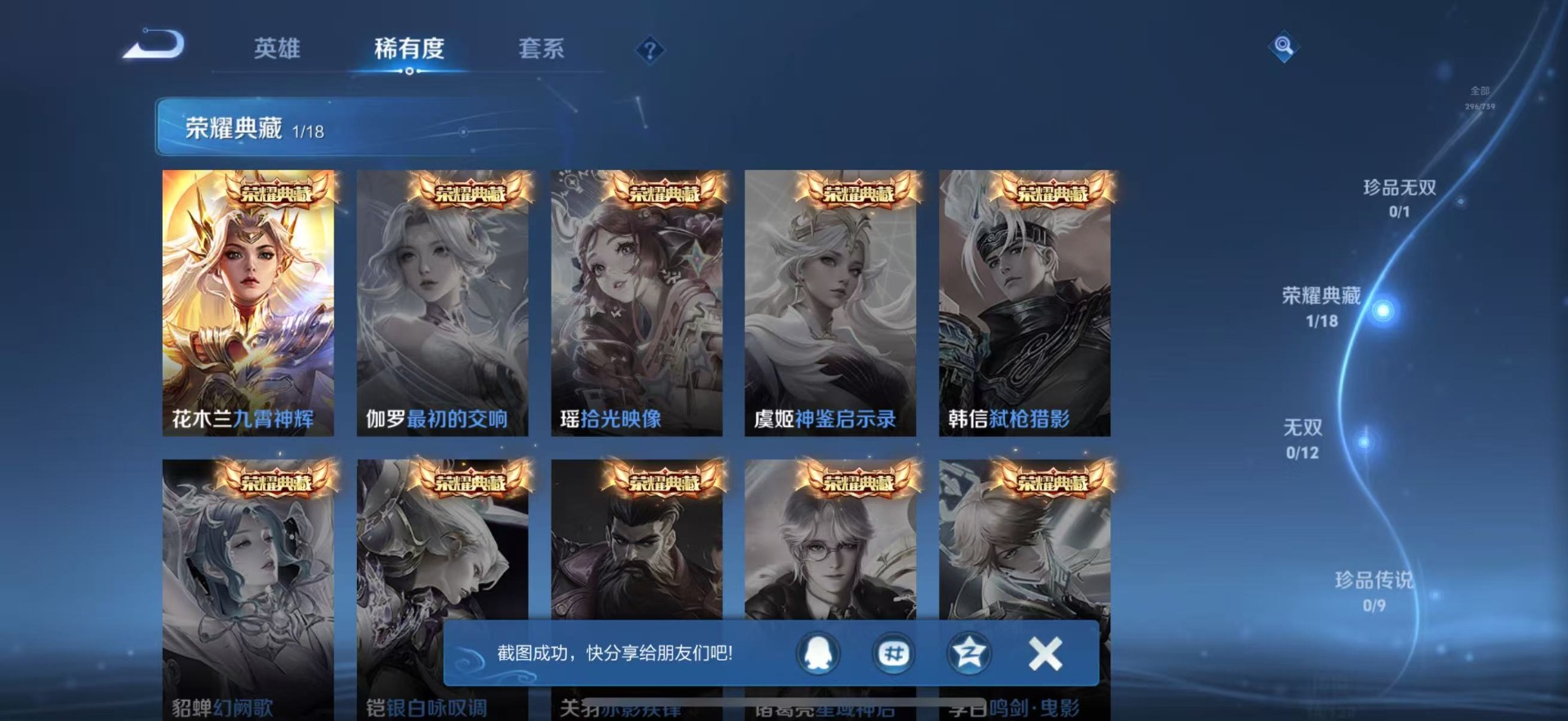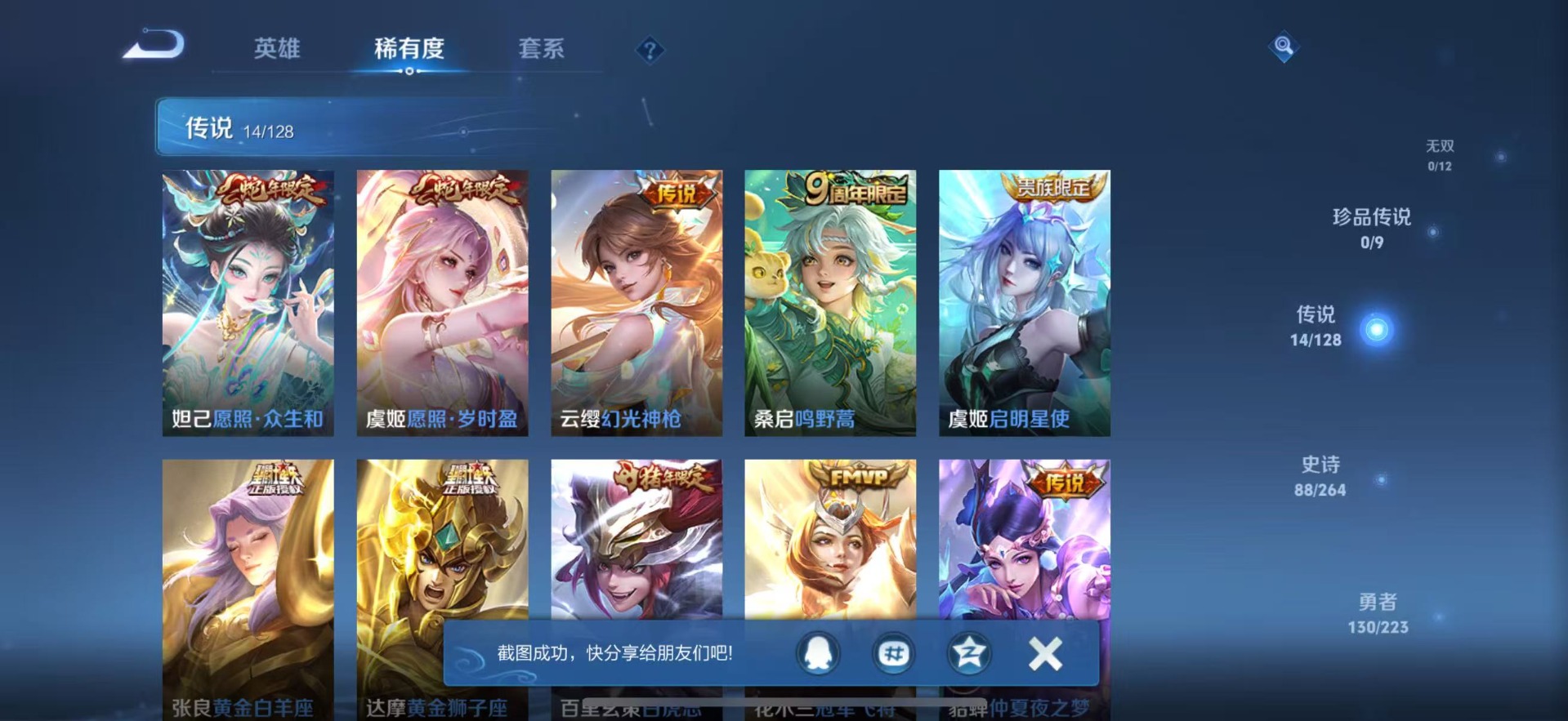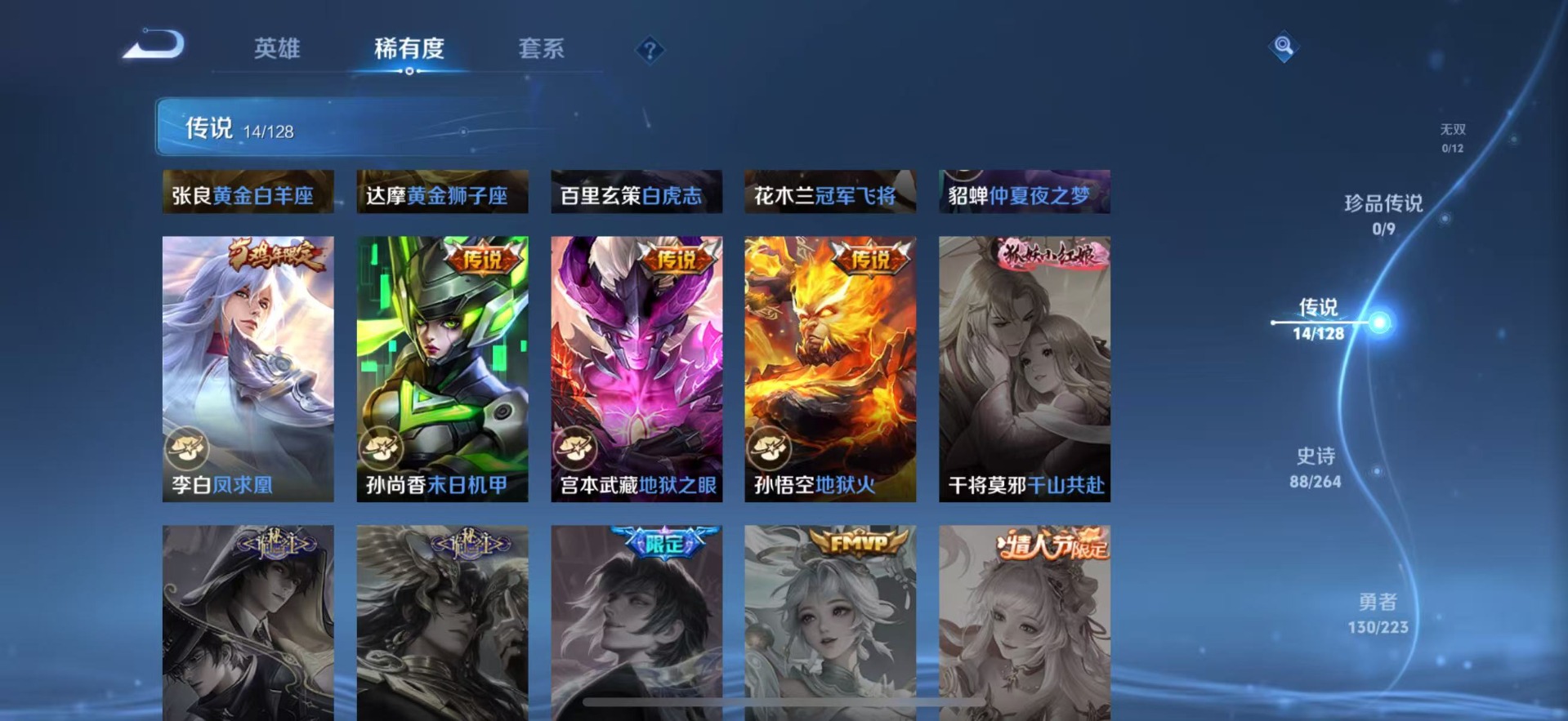 - [11714400]V6 1无双 1珍品传说 5传说 121英雄 136皮肤 可修改实名 貂蝉小国标 优质装备:离恨烟(公孙离无双),器灵·落星盏,炽阳神光,仲夏夜之梦(大飞蛾) 传说皮:幻光神枪 限定皮:愿照·九州拓(澜年限),陌上桑,鸣野蒿,至尊宝,玉兔公主 史诗皮:器灵·浮梦炉,化蝶舞,星界战将,龙之律动,怒海争锋,炽弈燎原,破空之剑,蒙犽顽岩魄,芈月浮光幕影,蔬乡物语(鲁班七号),百相守梦-百里守约,百相守梦-黄忠,遇见神鹿,紫霞仙子,黄金分割率,特工魅影,猫狗日记-孙策,节奏热浪,水果甜心,星夜王子,功夫厨神,暗隐猎兽者,鬼剑武藏,舞动绿茵,缤纷独角兽,乘风破浪,水晶猎龙者,曙光守护者,原初追逐者,圣诞狂欢,圣诞恋歌,鹰眼统帅,魅力维加斯
