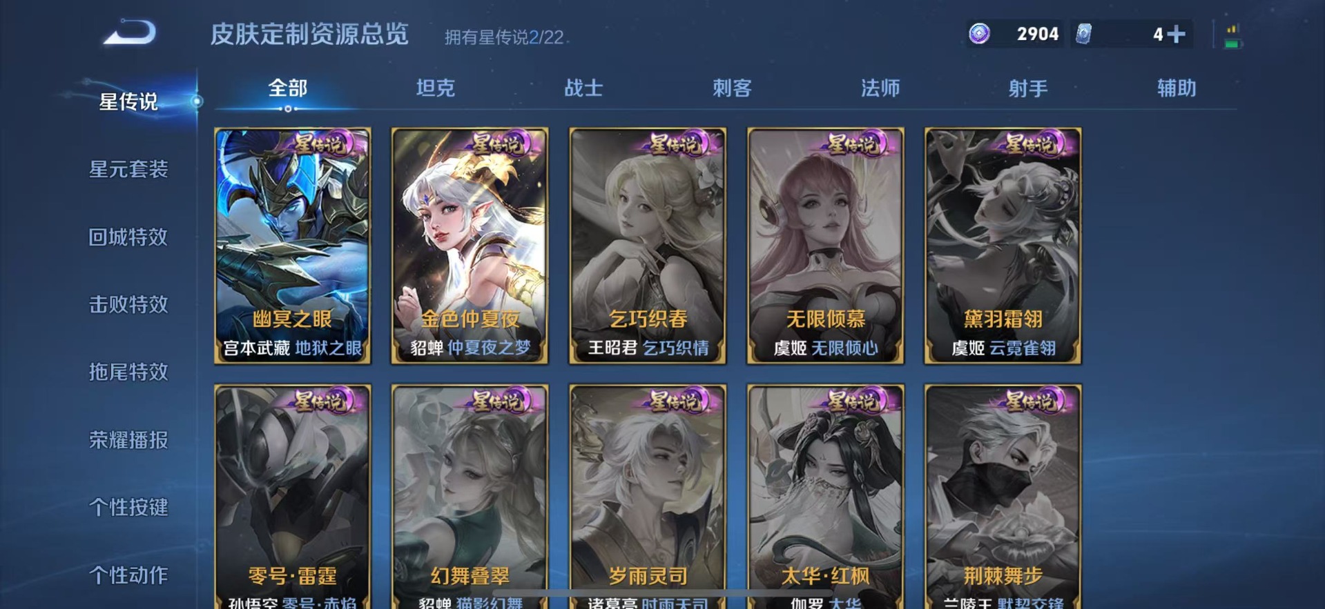 大乔白鹤梁神女,铠青龙志,曹操天狼征服者,伽罗天狼溯光者,苏烈玄武志,干将莫邪冰霜恋舞曲,牛魔奔雷神使,貂蝉逐梦之音,裴擒虎天狼狩猎者,上官婉儿梁祝,花木兰瑞麟志,桑启鸣野蒿,猪八戒猪悟能,孙悟空至尊宝,百里玄策白虎志,雅典娜神奇女侠,赵云引擎之心,妲己愿照·众生和,韩信逐梦之影,百里守约朱雀志,虞姬愿照·岁时盈,关羽冰锋战神
