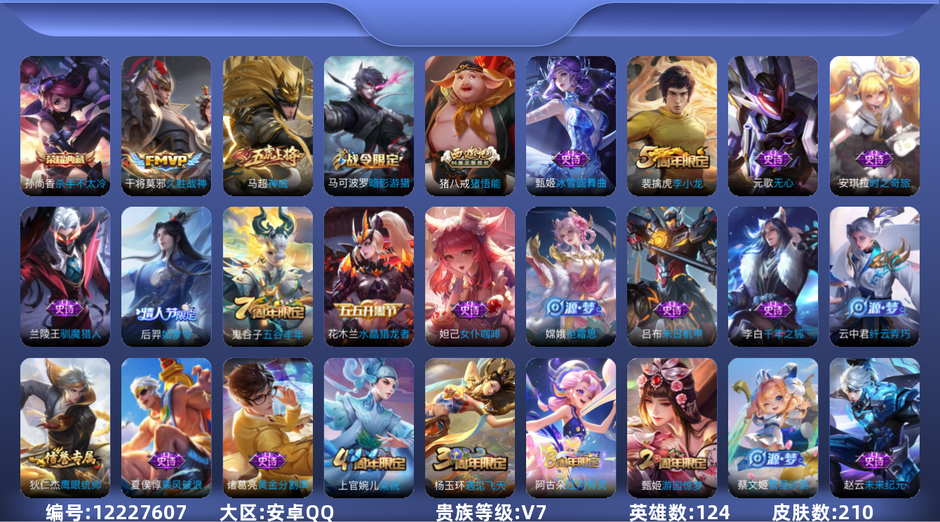 [12227607]V7 1典藏 1传说 124英雄 210皮肤 可修改实名 优质装备:杀手不太冷,久胜战神 珍宝阁皮:优雅恋人,玩趣恶龙 限定皮:神威(电光马子),遇见飞天,高山流水,五谷丰年,游园惊梦,梁祝,李小龙,如梦令-后羿,猪悟能 史诗皮:黄金分割率,千年之狐,江河有灵,冰冠公主,偶像歌手,末日机甲-吕布,女仆咖啡,摇滚巨星,水果甜心,时之奇旅-安琪拉,功夫厨神,暗隐猎兽者,鬼剑武藏,心灵战警,纤云弄巧,繁星吟游(呼啦呼啦),拒霜思,缤纷独角兽,乘风破浪,月团寄思,水晶猎龙者,金属风暴,圣诞狂欢,圣诞恋歌,鹰眼统帅,无心,未来纪元-赵云