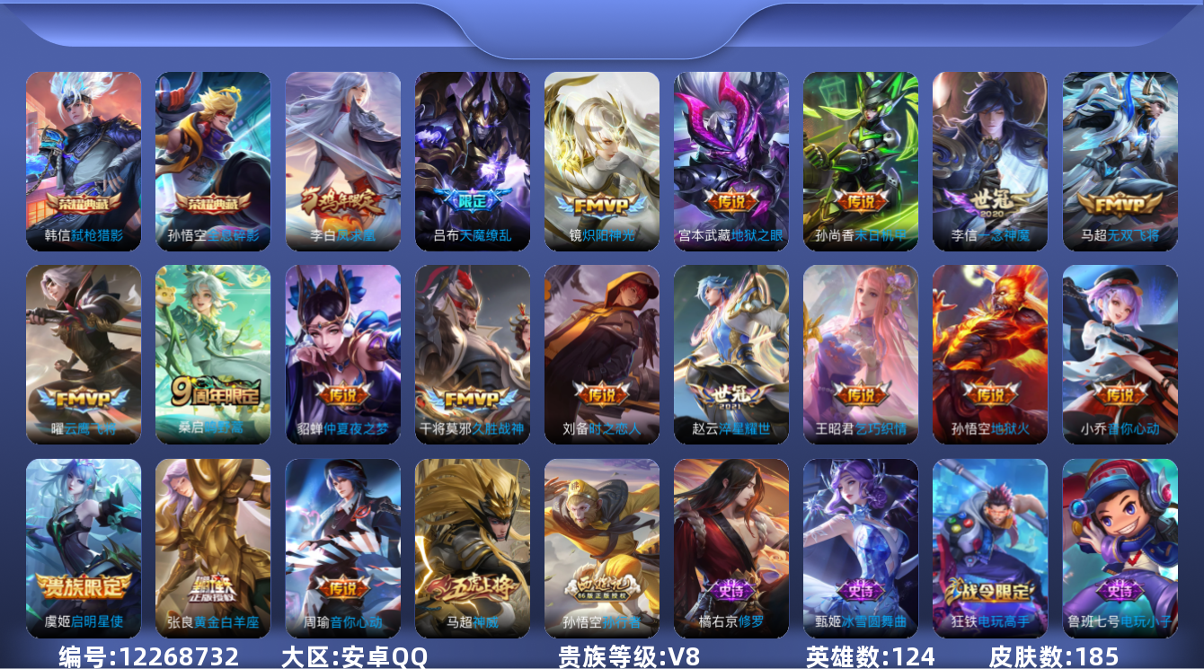 [12268732]【商品标题】:安卓Q-V8-永恒钻石I段位-124英雄-185皮肤-2典藏-0珍品无双-0无双-0珍品传说-19传说-42史诗