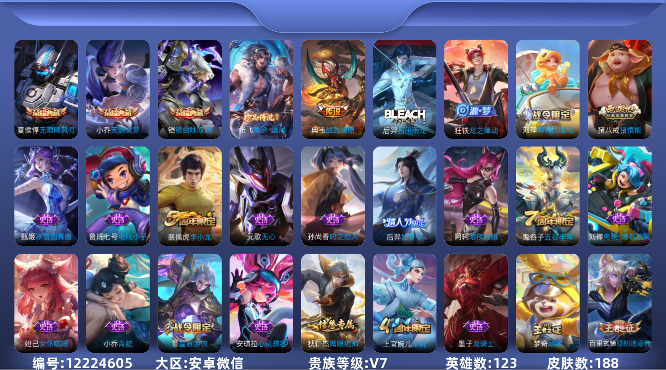 [12224605]V7 3典藏 1珍品传说 1传说 123英雄 188皮肤 可修改实名 优质装备:天鹅之梦(小乔典藏),无限飓风号(高达),银白咏叹调(倪克斯侍卫) 珍品传说:兔狲·蓬尾 传说皮:典韦战鼓燎原 珍宝阁皮:胡桃夹子 限定皮:逐霄战戟,玄嵩(庄周年限),高山流水,五谷丰年,梁祝,李小龙,如梦令-后羿,猪悟能 史诗皮:鸭鸭历险记-刘禅,龙之律动,石田雨龙,蔬乡物语(鲁班七号),苍穹之光,电玩小子(小书包),电玩·爆裂旋风,蒙恬荣光圣徽,偶像歌手,龙骑士(小龙虾),暗夜猫娘,青蛇,猫狗日记-孙策,时之恋人-孙尚香,女仆咖啡,摇滚巨星,水果甜心,绅士熊喵,天才门将,心灵骇客,暗隐猎兽者,鬼剑武藏,乐园奇幻夜,地狱岩魂,繁星吟游(呼啦呼啦),缤纷独角兽,逐浪之夏,箭羽风息,金属风暴,原初追逐者,圣诞狂欢,鹰眼统帅,魅力维加斯,黎明之约,无心