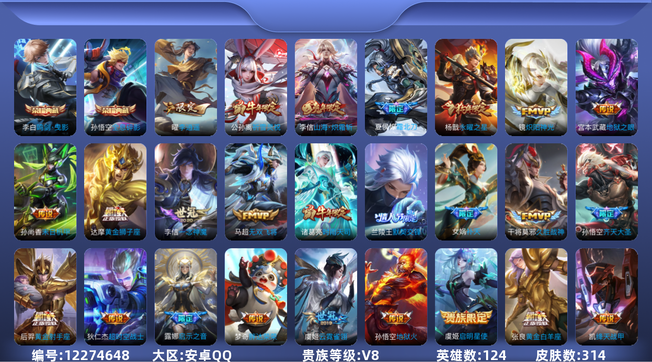 [12274648]【商品标题】:安卓Q-V8-最强王者段位-124英雄-314皮肤-2典藏-0珍品无双-0无双-0珍品传说-25传说-85史诗
