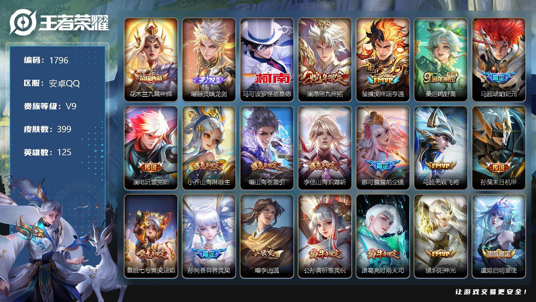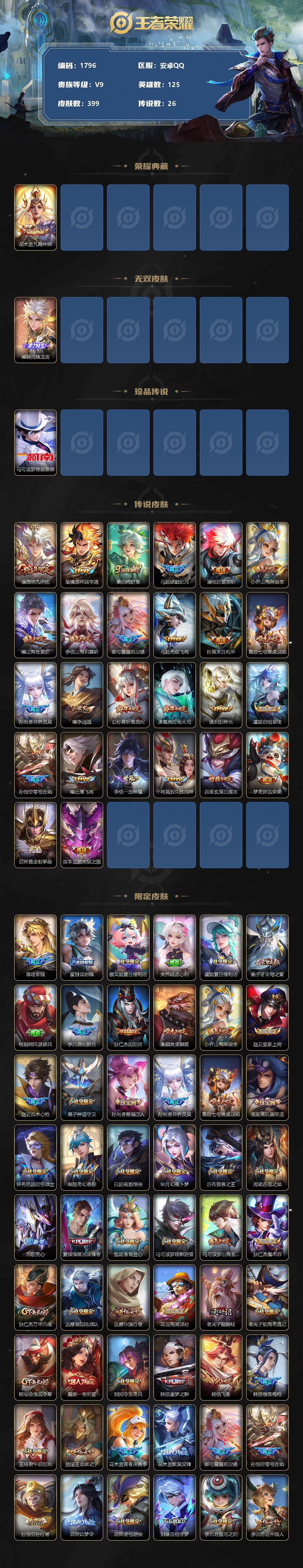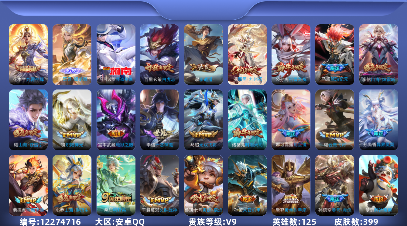 [12274716]【商品标题】:安卓Q-V8-最强王者段位-125英雄-399皮肤-1典藏-0珍品无双-1无双-1珍品传说-26传说-122史诗