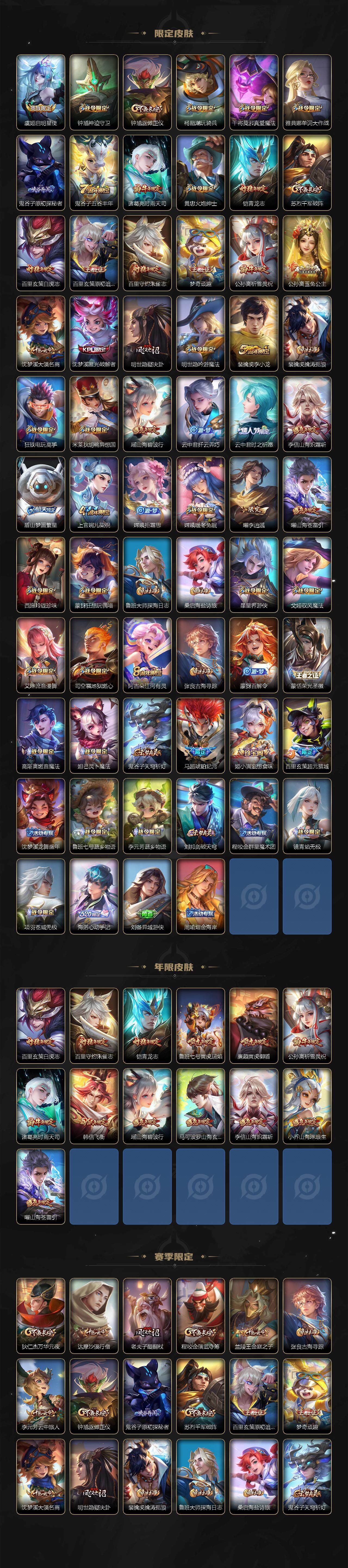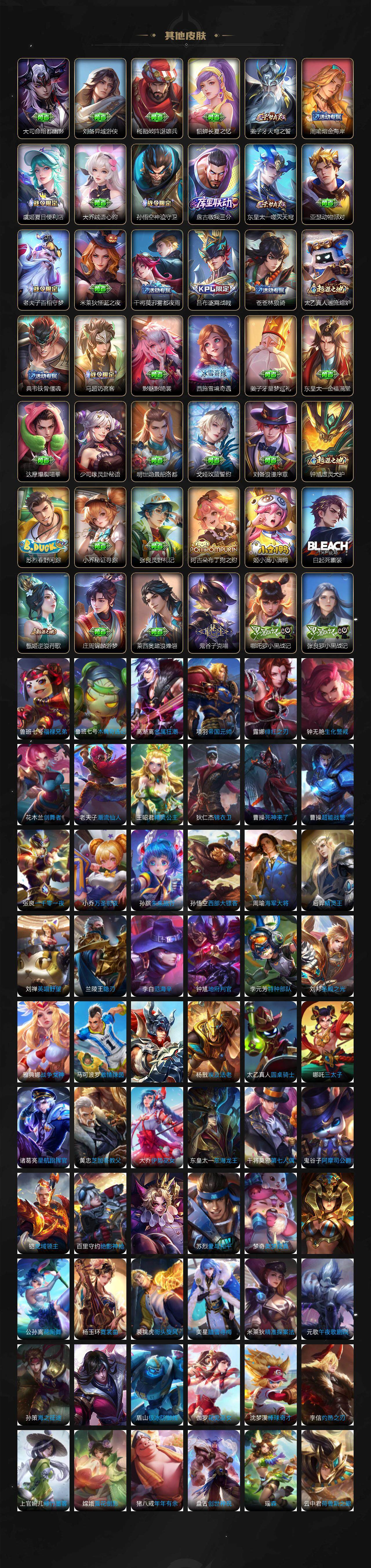 【限定皮肤】:暃埋骨钱,蒙犽顽岩魄,蔡文姬夏日便利店,大乔绒语心约,虞姬夏日便利店,姜子牙天穹之誓,杨戬破阵退雄兵,李白谪仙醉月,狄仁杰阴阳师,廉颇寅虎御盾,小乔山海琳琅生,赵云皇家上将,赵云百木心枪,墨子神迹守卫,孙尚香蔷薇恋人,孙尚香异界灵契,鲁班七号寅虎瑞焰,高渐离玩趣恶龙,钟无艳超时空战士,扁鹊奇幻香踪,白起夜都怪侠,芈月幻夜卜梦,吕布猎兽之王,周瑜赤莲之焰,元歌无心,夏侯惇匿光决锋者,甄姬落雪兰心,马可波罗暗影游猎,马可波罗山海玄木吟,狄仁杰魔术师,狄仁杰万华元夜,达摩星际陆战队,达摩沙漠行僧,项羽海滩派对,老夫子醍醐杖,老夫子航海奇遇记,程咬金演武夺筹,露娜一生所爱,刘邦夺宝奇兵,韩信逐梦之影,韩信飞衡,韩信傲雪梅枪,王昭君午后时光,兰陵王金庭之子,花木兰青春决赛季,花木兰默契交锋,娜可露露前尘镜,孙悟空零号赤焰,孙悟空孙行者,后羿如梦令,后羿圣弓游侠,刘备百相守梦,李元芳银河之约,李元芳云中旅人,虞姬启明星使,钟馗神迹守卫,钟馗驱傩正仪,杨戬潮玩骑兵,干将莫邪真爱魔法,雅典娜单词大作战,鬼谷子原初探秘者,鬼谷子五谷丰年,诸葛亮时雨天司,黄忠火炮绅士,铠青龙志,苏烈千军破阵,百里玄策白虎志,百里玄策原初追逐者,百里守约朱雀志,梦奇顽趣,公孙离祈雪灵祝,公孙离玉兔公主,沈梦溪大漠名商,沈梦溪匿光破解者,明世隐疑决卦,明世隐吟游魔法,裴擒虎李小龙,裴擒虎擒涛扼浪,狂铁电玩高手,米莱狄胡桃异想国,瑶山海碧波行,云中君纤云弄巧,云中君时之祈愿,李信