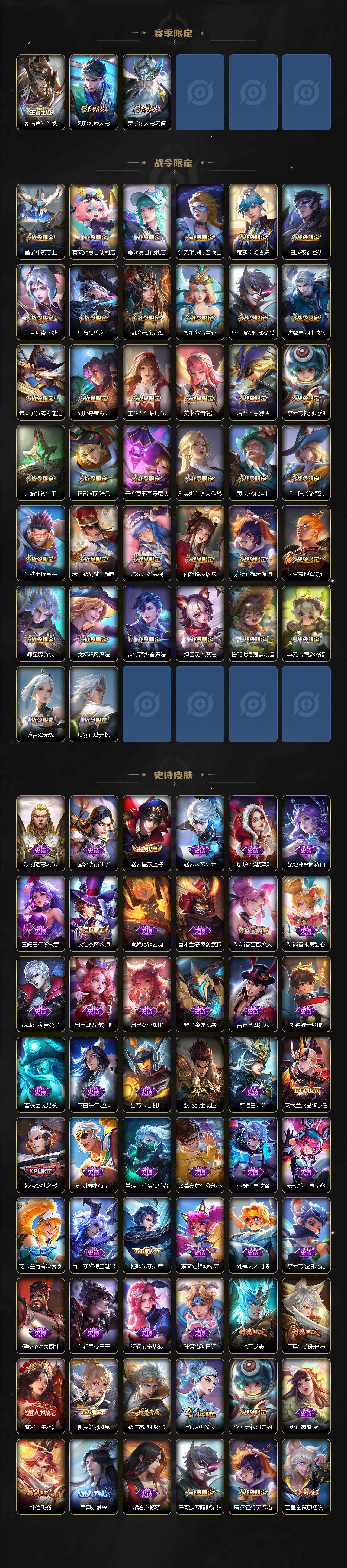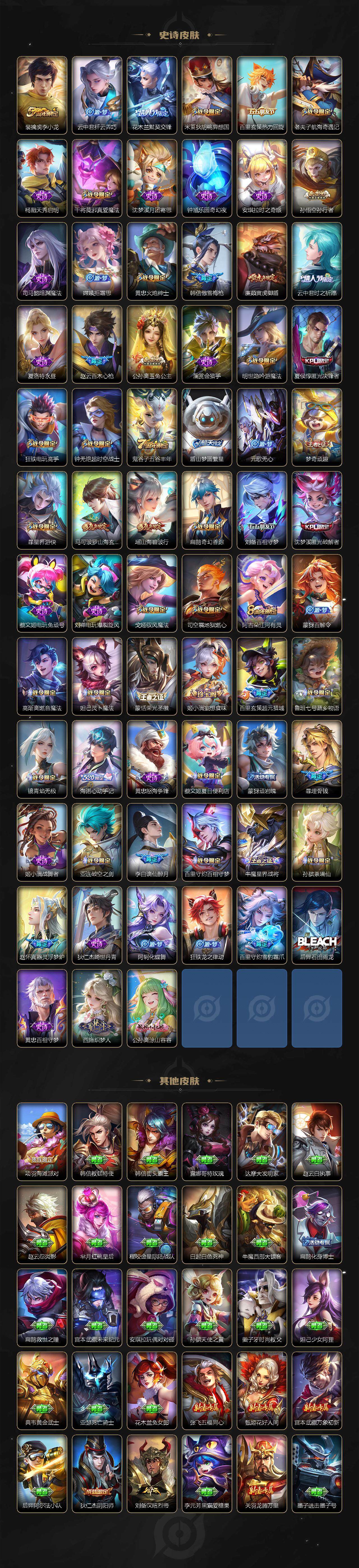 - [11817018]V10 5典藏 64传说 125英雄 526皮肤 可修改实名 优质装备:鸣剑·曳影,银白咏叹调(倪克斯侍卫),幻阙歌(貂蝉典藏),神鉴启示录,拾光映像(瑶典藏),黄金狮子座,黄金射手座,冠军飞将,绛天战甲(鸡嘴战神),猫影幻舞,久胜战神,炽阳神光,一念神魔,仲夏夜之梦(大飞蛾),音你心动-小乔,地狱之眼,胖达荣荣,时之恋人-刘备(电焊工),游龙清影(小青龙),淬星耀世,超时空战士-狄仁杰,花朝如约(花篮子),无双飞将,神器·狴犴令,山海·炽霜斩(李信年限),炽翼辉光(娃娃菜牛角包),浮生妄,追逃游戏(亚瑟),鹤羽星尊,灼幽烈阳,妄想实况,妄想奇谈,鹤归松栖(云缨),惊梅引,遇见神鼓,鲁班七号-时之奇旅,大乔-时之奇旅,永恒水手月亮,夜礼服假面,霜月吟,澜逐花归海,艾琳觅芳踪,琥珀纪元铠,琥珀纪元马超,金乌负日,黄金天蝎座,云中君群星魔术团,朵莉亚心动手记 传说皮:乘龙·问璇玑(孙尚香年限),乘龙·铭钟鼎(赵云年限),乘龙·淬吴钩(孙策年限),貂蝉曦玄引,吕布曦玄引,典韦战鼓燎原,落雪白狼,云诺千山 珍宝阁皮:妄想食味,优雅恋人,蔷薇恋人 限定皮:逐霄战戟,至尊宝,武陵仙君(小桃花),异界灵契(白毛香),傲雪梅枪,补天,寅虎·展翼(孙膑年限),星穹之声,白鹤梁神女,白晶晶,至美·乘鲤谣,至美·化雀舞,影龙天霄,遇见飞天,高山流水,诗剑行,无限倾心-虞姬,匿光决锋者,怒海麟威,降魔,五谷丰年,青龙志(铠年限),冰锋战神,天狼运算者,游园惊梦,梁祝,御风骁将(吕布年限),龙胆,逐梦之翼,逐梦之星,烈魂,岱宗(典韦年限),天狼溯光者,天狼征服者,李小龙,逐梦之影,朱雀志(守约年限),如梦令-后羿,霸王别姬-虞姬,孙行者,猪悟能,一生所爱,大圣娶亲,引擎之心,天魔缭乱,云端筑梦师,乒乒小将,热情桑巴,神奇女侠,美猴王,女儿国国王,寅虎·御盾(廉颇年限),寅虎·心曲(虎婆),百木心枪,玉兔公主,无尽星芒,唐三藏,枫霜尽,匿光启智者,神器·万象笔,梦圆繁星 史诗皮:鸭鸭历险记-刘禅,化蝶舞,灵蛊蚀心,星界战将,龙之律动,雪豹·霜爪,石田雨龙,百相守梦-周瑜,茶境仙,怒海争锋,芈月浮光幕影,海诺心动手记,琥珀纪元伽罗,夜落电台,决胜骁骑,上官婉儿群星魔术团,奇遇星旅,蔬乡物语(鲁班七号),超元猎域,乘龙·聚宝船(安琪拉年限),乘龙·忆丹青(大乔年限),百相守梦-黄忠,遇见神鹿,紫