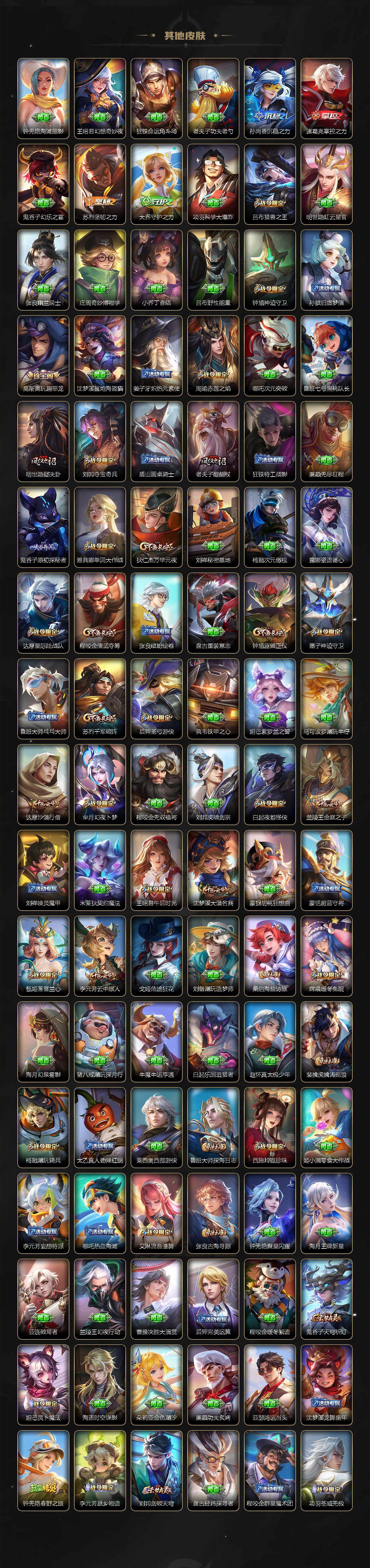 娜可露露晚萤,伽罗箭羽风息,李元芳逐浪之夏,孙策猫狗日记,阿轲节奏热浪,露娜紫霞仙子,诸葛亮黄金分割率,王昭君偶像歌手,韩信白龙吟,项羽苍穹之光,吕布末日机甲,橘右京修罗,刘禅绅士熊喵,刘禅天才门将,白起星夜王子,安琪拉心灵骇客,安琪拉时之奇旅,程咬金功夫厨神,兰陵王暗隐猎兽者,曹操幽灵船长,宫本武藏鬼剑武藏,司马懿暗渊魔法,亚瑟心灵战警,钟馗乐园奇幻夜,杨戬天秀·启明,蔡文姬舞动绿茵,廉颇地狱岩魂,夏侯惇乘风破浪,花木兰水晶猎龙者,铠曙光守护者,百里玄策热力回旋,墨子金属风暴,百里玄策原初追逐者,吕布圣诞狂欢,貂蝉圣诞恋歌,百里守约特工魅影,嬴政暗夜贵公子,嫦娥拒霜思,李白千年之狐,夏洛特永昼,澜赏金猎手,刘备百相守梦,沈梦溪匿光破解者,蔡文姬电玩·兔顽号,刘禅电玩·爆裂旋风,蒙犽百解令,高渐离燃音魔法,海诺心动手记,李白谪仙醉月,赵怀真器灵·浮梦炉,狄仁杰绮世丹青