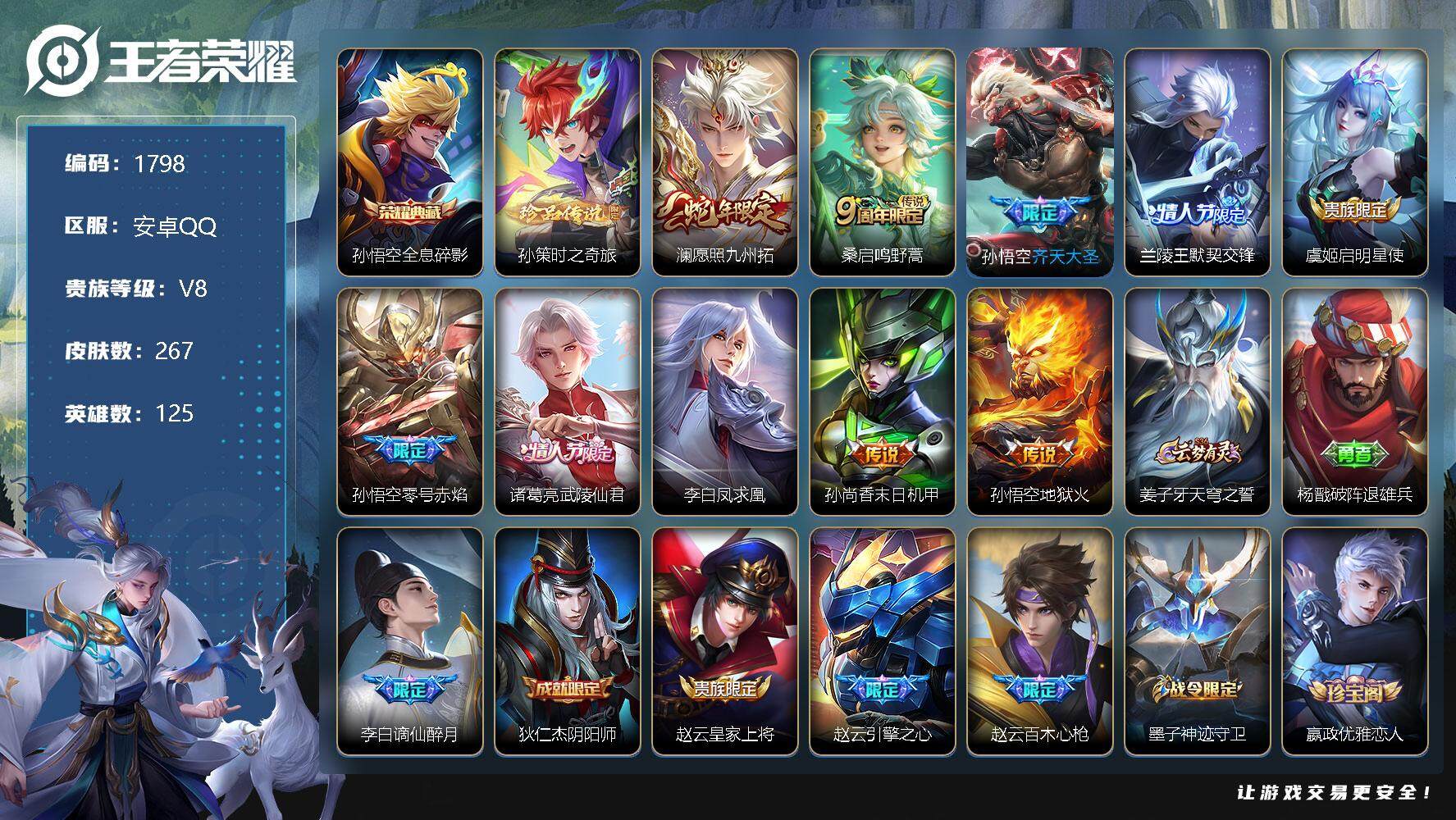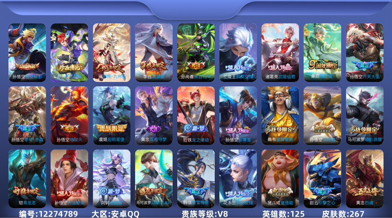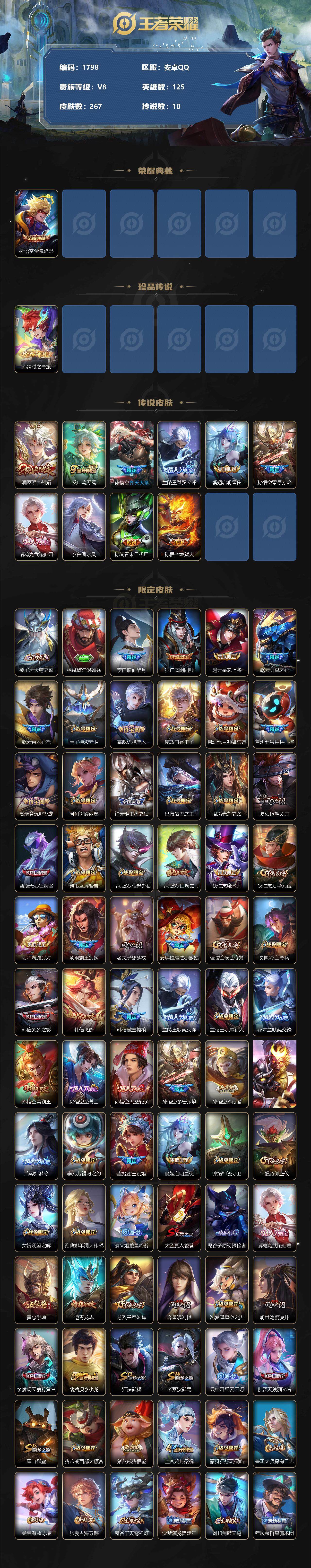 [12274789]【商品标题】:安卓Q-V8-永恒钻石II段位-125英雄-267皮肤-1典藏-0珍品无双-0无双-1珍品传说-10传说-68史诗
