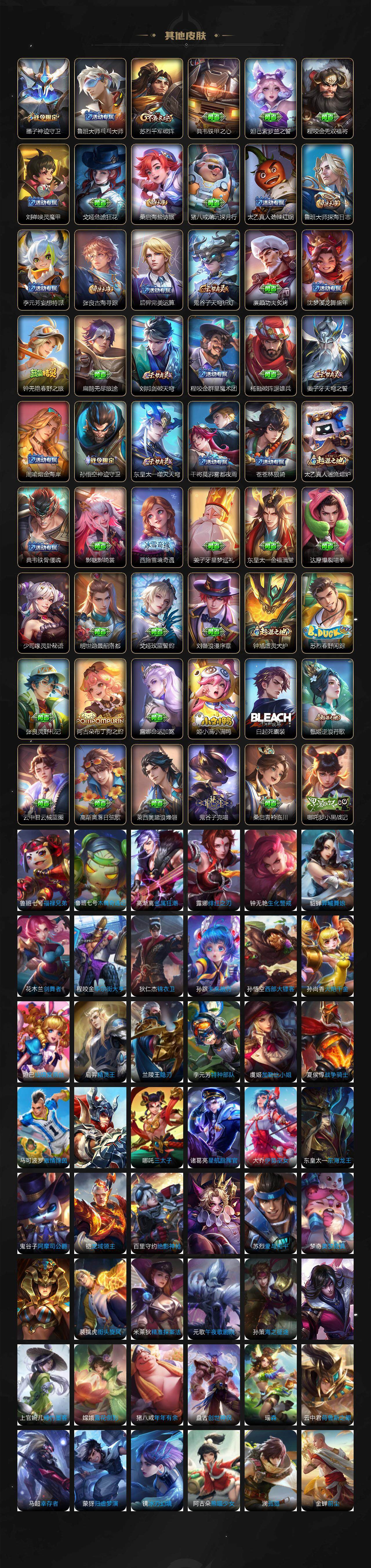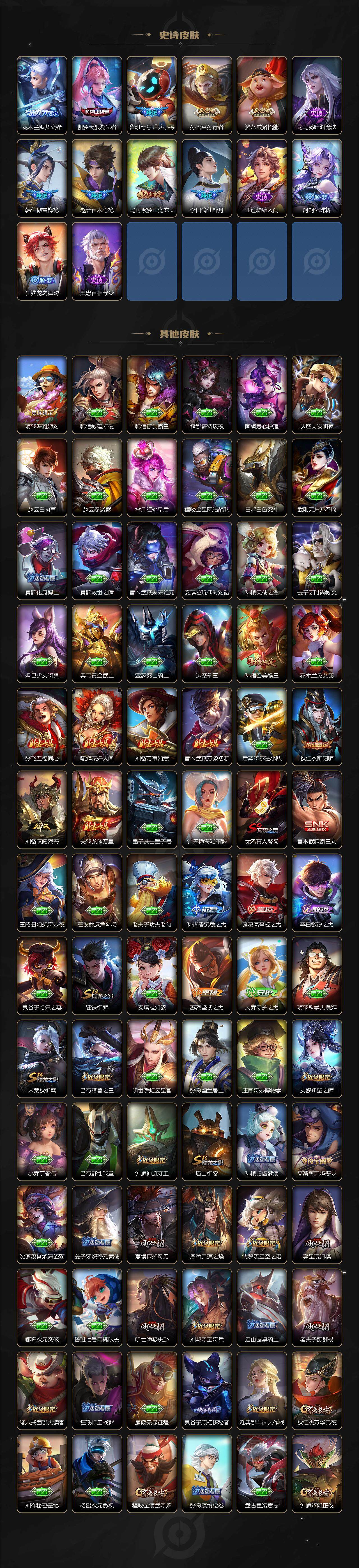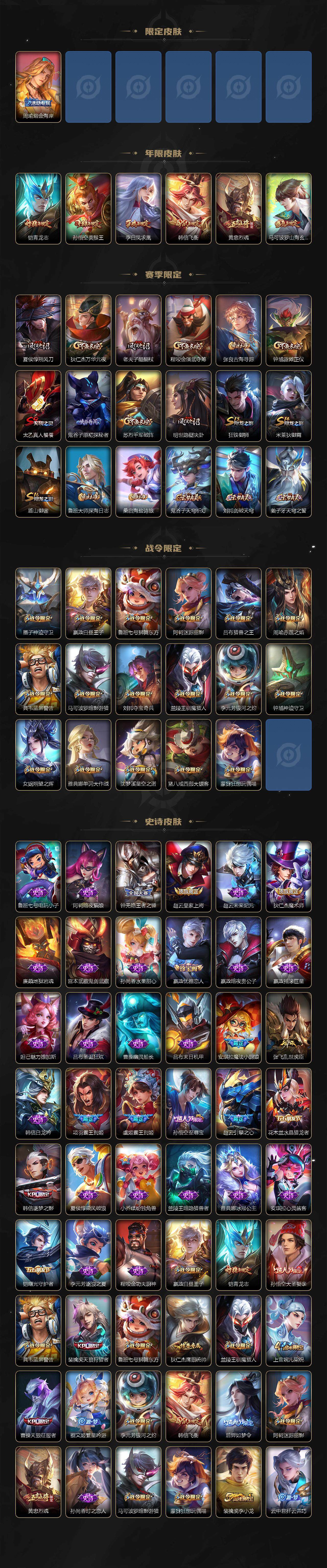 【限定皮肤】:姜子牙天穹之誓,杨戬破阵退雄兵,李白谪仙醉月,狄仁杰阴阳师,赵云皇家上将,赵云引擎之心,赵云百木心枪,墨子神迹守卫,嬴政优雅恋人,嬴政白昼王子,鲁班七号狮舞东方,鲁班七号乒乒小将,高渐离玩趣恶龙,阿轲迷踪丽影,钟无艳王者之锤,吕布猎兽之王,周瑜赤莲之焰,夏侯惇朔风刀,曹操天狼征服者,典韦蓝屏警告,马可波罗暗影游猎,马可波罗山海玄木吟,狄仁杰魔术师,狄仁杰万华元夜,项羽海滩派对,项羽霸王别姬,老夫子醍醐杖,安琪拉魔法小厨娘,程咬金演武夺筹,刘邦夺宝奇兵,韩信逐梦之影,韩信飞衡,韩信傲雪梅枪,兰陵王默契交锋,兰陵王驯魔猎人,花木兰默契交锋,孙悟空美猴王,孙悟空至尊宝,孙悟空大圣娶亲,孙悟空零号赤焰,孙悟空孙行者,孙悟空齐天大圣,后羿如梦令,李元芳银河之约,虞姬霸王别姬,虞姬启明星使,钟馗神迹守卫,钟馗驱傩正仪,女娲朔望之晖,雅典娜单词大作战,蔡文姬繁星吟游,太乙真人饕餮,鬼谷子原初探秘者,诸葛亮武陵仙君,黄忠烈魂,铠青龙志,苏烈千军破阵,弈星混沌棋,沈梦溪星空之诺,明世隐疑决卦,裴擒虎天狼狩猎者,裴擒虎李小龙,狂铁御狮,米莱狄御霄,云中君纤云弄巧,伽罗天狼溯光者,盾山御銮,猪八戒西部大镖客,猪八戒猪悟能,上官婉儿梁祝,蒙犽狂想玩偶喵,鲁班大师探海日志,桑启海盐诗旅,张良古海寻踪,鬼谷子天穹祈灯,沈梦溪龙舞盛年,刘邦剑破天穹,程咬金群星魔术团,周瑜熔金海岸