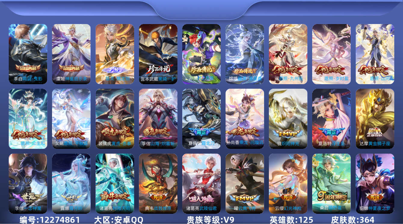 [12274861]【商品标题】:安卓Q-V7-至尊星耀IV段位-125英雄-364皮肤-2典藏-0珍品无双-1无双-3珍品传说-32传说-127史诗
