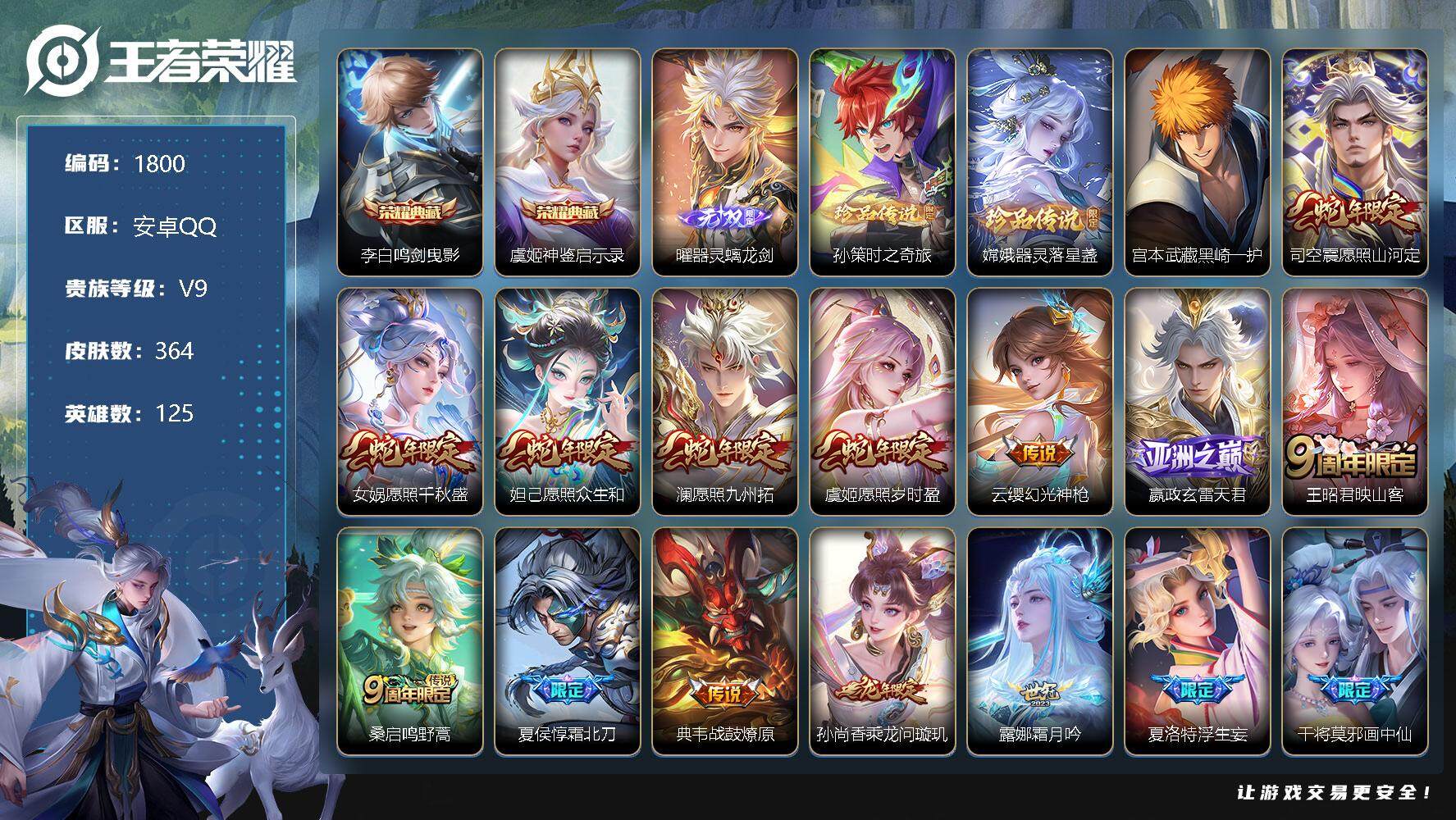 [12274861]【商品标题】:安卓Q-V7-至尊星耀IV段位-125英雄-364皮肤-2典藏-0珍品无双-1无双-3珍品传说-32传说-127史诗 【英雄全皮】:苍全皮,李信全皮,嫦娥全皮,蒙恬全皮,夏洛特全皮,司空震全皮,戈娅全皮,空空儿全皮,影全皮 【荣耀典藏】:李白鸣剑曳影,虞姬神鉴启示录 【无双皮肤】:曜器灵螭龙剑 【珍品传说】:孙策时之奇旅,嫦娥器灵落星盏,宫本武藏黑崎一护 【传说皮肤】:司空震愿照山河定,女娲愿照千秋盛,妲己愿照众生和,澜愿照九州拓,虞姬愿照岁时盈,云缨幻光神枪,嬴政玄雷天君,王昭君映山客,桑启鸣野蒿,夏侯惇霜北刀,典韦战鼓燎原,孙尚香乘龙问璇玑,露娜霜月吟,夏洛特浮生妄,干将莫邪画中仙,孙悟空齐天大圣,李信山海炽霜斩,裴擒虎寅虎赤拳,赵云淬星耀世,诸葛亮时雨天司,铠绛天战甲,镜炽阳神光,虞姬启明星使,曜云鹰飞将,李信一念神魔,刘备时之恋人,干将莫邪久胜战神,达摩黄金狮子座,梦奇胖达荣荣,诸葛亮武陵仙君,貂蝉仲夏夜之梦,狄仁杰超时空战士 【限定皮肤】:夏侯惇霜北刀,蔡文姬夏日便利店,虞姬夏日便利店,姜子牙天穹之誓,狄仁杰阴阳师,廉颇寅虎御盾,赵云皇家上将,墨子神迹守卫,孙尚香蔷薇恋人,鲁班七号乒乒小将,庄周高山流水,高渐离玩趣恶龙,孙膑天狼运算者,扁鹊奇幻香踪,白起夜都怪侠,芈月白晶晶,芈月幻夜卜梦,周瑜赤莲之焰,元歌云间偶戏,元歌无心,甄姬落雪兰心,马可波罗逐梦之星,马可波罗山海玄木吟,狄仁杰魔术师,狄仁杰万华元夜,达摩星际陆战队,达摩沙漠行僧,项羽海滩派对,项羽霸王别姬,老夫子醍醐杖,老夫子航海奇遇记,程咬金演武夺筹,露娜一生所爱,韩信逐梦之影,韩信傲雪梅枪,兰陵王金庭之子,花木兰青春决赛季,亚瑟潮玩骑士王,孙悟空孙行者,孙悟空齐天大圣,后羿如梦令,后羿圣弓游侠,李元芳云中旅人,虞姬启明星使,钟馗驱傩正仪,杨玉环寅虎心曲,杨戬潮玩骑兵,哪吒逐梦之翼,干将莫邪冰霜恋舞曲,干将莫邪真爱魔法,干将莫邪画中仙,雅典娜黎明之约,鬼谷子原初探秘者,鬼谷子五谷丰年,诸葛亮武陵仙君,诸葛亮时雨天司,黄忠火炮绅士,苏烈千军破阵,百里玄策原初追逐者,百里守约朱雀志,梦奇顽趣,公孙离玉兔公主,沈梦溪大漠名商,明世隐吟游魔法,裴擒虎李小龙,裴擒虎寅虎赤拳,裴擒虎擒涛扼浪,米莱狄胡桃异想国,云中君纤云弄巧,云中君时之祈愿,李信山海炽霜斩,伽罗天狼溯光者,上官婉儿梁祝,上官婉