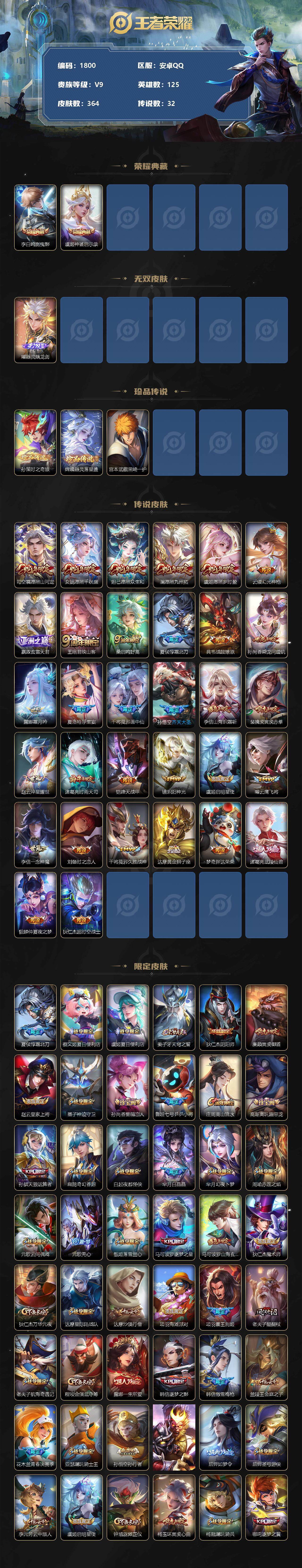 - [11598250]V8 1典藏 17传说 125英雄 289皮肤 可修改实名 优质装备:杀手不太冷,久胜战神,炽阳神光,一念神魔,音你心动-周瑜,无双飞将,山海·炽霜斩(李信年限),浮生妄,永恒水手月亮,夜礼服假面,霜月吟,澜逐花归海 传说皮:祥瑞亨通,幻光神枪 珍宝阁皮:万物之道,女武神,玩趣恶龙 限定皮:愿照·九州拓(澜年限),鸣野蒿,神威(电光马子),至美·乘鲤谣,高山流水,五谷丰年,冰锋战神,游园惊梦,逐梦之星,天狼溯光者,李小龙,如梦令-后羿,真爱至上,孙行者,猪悟能,冰霜恋舞曲,匿光追影者,寅虎·心曲(虎婆),寅虎·赤拳(老虎年限),神器·万象笔 史诗皮:器灵·浮梦炉,化蝶舞,星界特工,石田雨龙,蔬乡物语(鲁班七号),琥珀纪元伽罗,百相守梦-百里守约,遇见神鹿,紫霞仙子,电玩小子(小书包),黄金分割率,特工魅影,千年之狐,永昼,匿光破解者,百相守梦(关羽),匿光侦查者,江河有灵,百解令(蒙犽),高渐离燃音魔法,蒙恬荣光圣徽,偶像歌手,魅语,无限星赏官,晚萤,末日机甲-吕布,猫狗日记-孙策,乱世虎臣,节奏热浪,修罗,女仆咖啡,摇滚巨星,水果甜心,天才门将,星夜王子,心灵骇客,功夫厨神,德古拉伯爵,暗隐猎兽者,幽灵船长,鬼剑武藏,心灵战警,天秀·启明,舞动绿茵,地狱岩魂,诗语江南,纤云弄巧,拒霜思,缤纷独角兽,乘风破浪,逐浪之夏,水晶猎龙者,金属风暴,原初追逐者,圣诞狂欢,圣诞恋歌,鹰眼统帅,魅力维加斯,黎明之约,无心,未来纪元-赵云,玫瑰异探