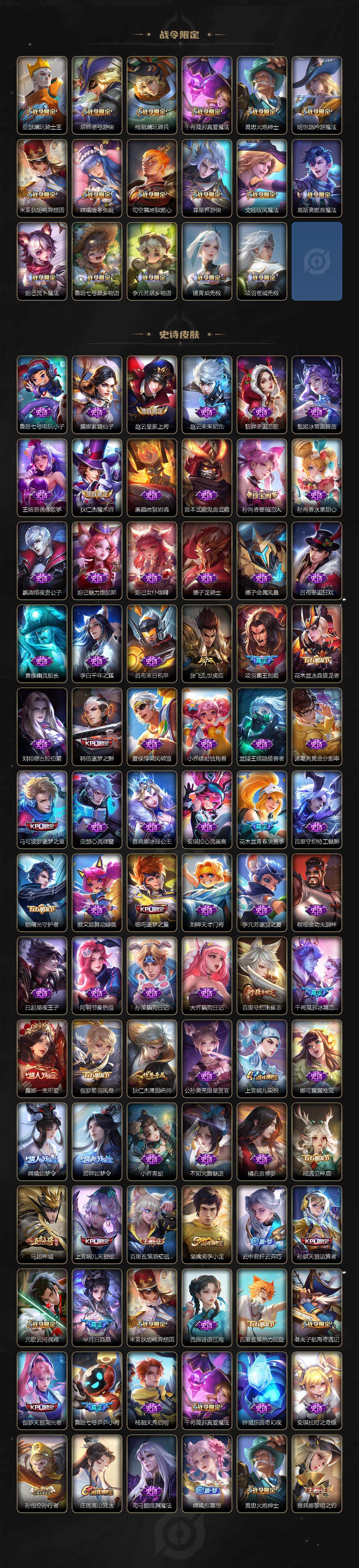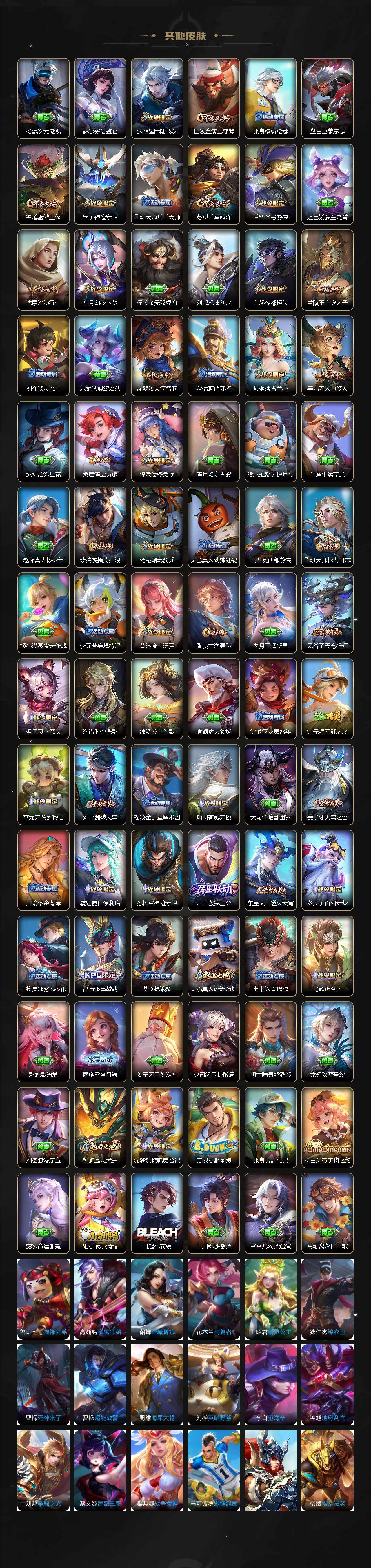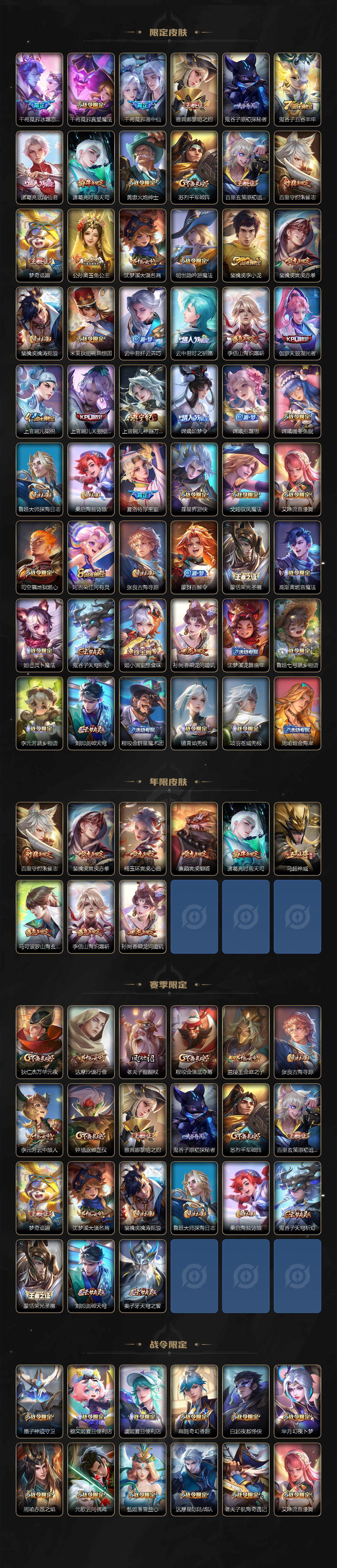 【限定皮肤】:夏侯惇霜北刀,蔡文姬夏日便利店,虞姬夏日便利店,姜子牙天穹之誓,狄仁杰阴阳师,廉颇寅虎御盾,赵云皇家上将,墨子神迹守卫,孙尚香蔷薇恋人,鲁班七号乒乒小将,庄周高山流水,高渐离玩趣恶龙,孙膑天狼运算者,扁鹊奇幻香踪,白起夜都怪侠,芈月白晶晶,芈月幻夜卜梦,周瑜赤莲之焰,元歌云间偶戏,元歌无心,甄姬落雪兰心,马可波罗逐梦之星,马可波罗山海玄木吟,狄仁杰魔术师,狄仁杰万华元夜,达摩星际陆战队,达摩沙漠行僧,项羽海滩派对,项羽霸王别姬,老夫子醍醐杖,老夫子航海奇遇记,程咬金演武夺筹,露娜一生所爱,韩信逐梦之影,韩信傲雪梅枪,兰陵王金庭之子,花木兰青春决赛季,亚瑟潮玩骑士王,孙悟空孙行者,孙悟空齐天大圣,后羿如梦令,后羿圣弓游侠,李元芳云中旅人,虞姬启明星使,钟馗驱傩正仪,杨玉环寅虎心曲,杨戬潮玩骑兵,哪吒逐梦之翼,干将莫邪冰霜恋舞曲,干将莫邪真爱魔法,干将莫邪画中仙,雅典娜黎明之约,鬼谷子原初探秘者,鬼谷子五谷丰年,诸葛亮武陵仙君,诸葛亮时雨天司,黄忠火炮绅士,苏烈千军破阵,百里玄策原初追逐者,百里守约朱雀志,梦奇顽趣,公孙离玉兔公主,沈梦溪大漠名商,明世隐吟游魔法,裴擒虎李小龙,裴擒虎寅虎赤拳,裴擒虎擒涛扼浪,米莱狄胡桃异想国,云中君纤云弄巧,云中君时之祈愿,李信山海炽霜斩,伽罗天狼溯光者,上官婉儿梁祝,上官婉
