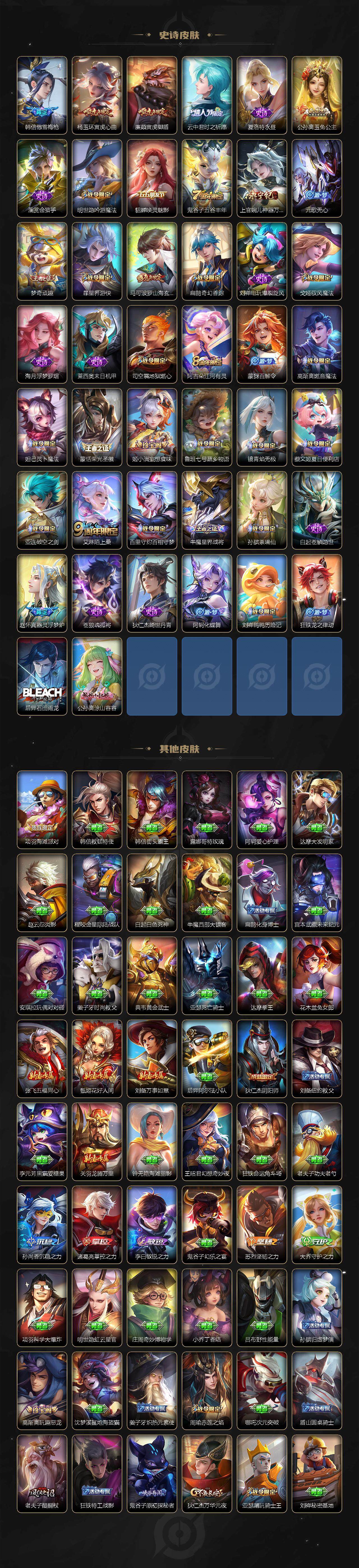 【英雄全皮】:苍全皮,李信全皮,嫦娥全皮,蒙恬全皮,夏洛特全皮,司空震全皮,戈娅全皮,空空儿全皮,影全皮
