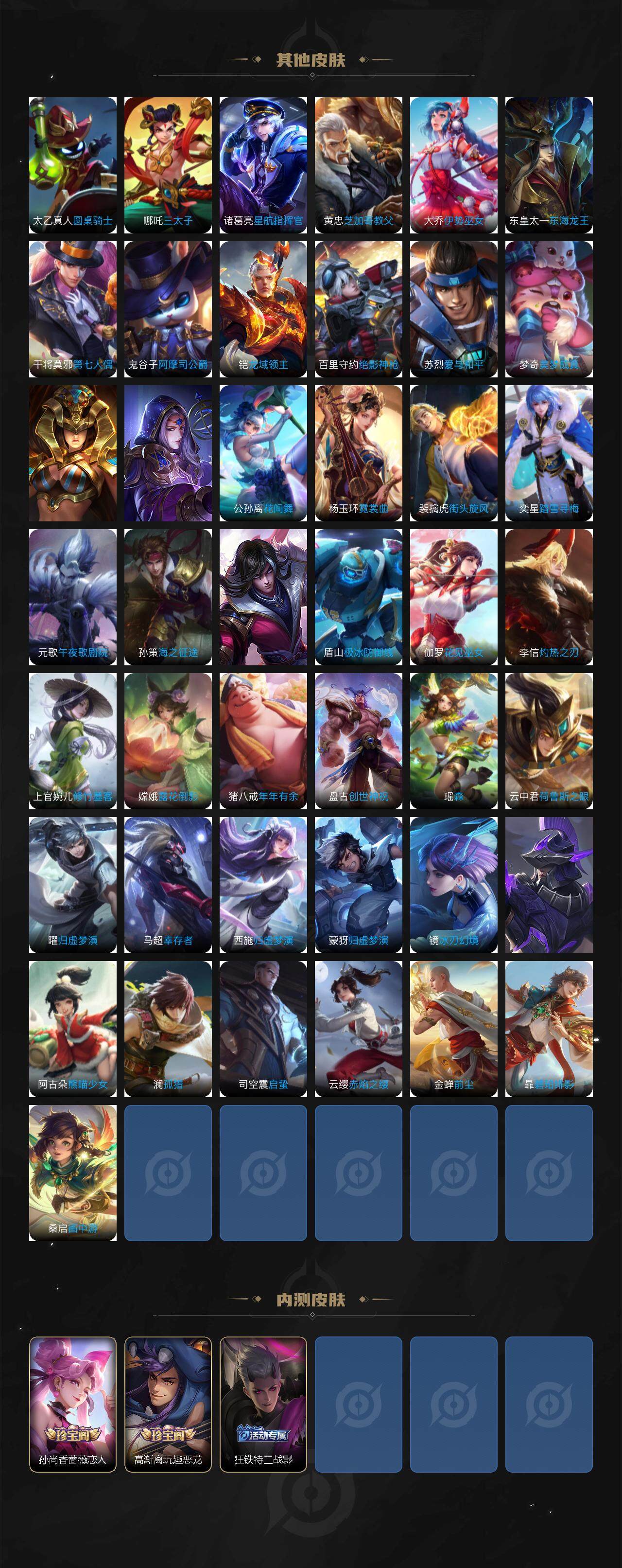 裴擒虎李小龙,上官婉儿梁祝,诸葛亮时雨天司,马超神威,孙膑天狼运算者,上官婉儿天狼绘梦者,伽罗天狼溯光者,哪吒逐梦之翼,马可波罗逐梦之星,韩信逐梦之影,百里守约朱雀志,项羽霸王别姬,露娜一生所爱,后羿如梦令,嫦娥如梦令,干将莫邪冰霜恋舞曲,花木兰青春决赛季,芈月白晶晶,鲁班七号乒乒小将,廉颇寅虎·御盾,孙悟空孙行者,韩信傲雪梅枪,杨玉环寅虎·心曲,裴擒虎寅虎·赤拳,云中君时之祈愿,公孙离玉兔公主,上官婉儿神器·万象笔,马可波罗山海·玄木吟,夏侯惇霜北刀,桑启鸣野蒿,艾琳陌上桑,王昭君映山客,澜愿照·九州拓,虞姬愿照·岁时盈,司空震愿照·山河定,妲己愿照·众生和,女娲愿照·千秋盛