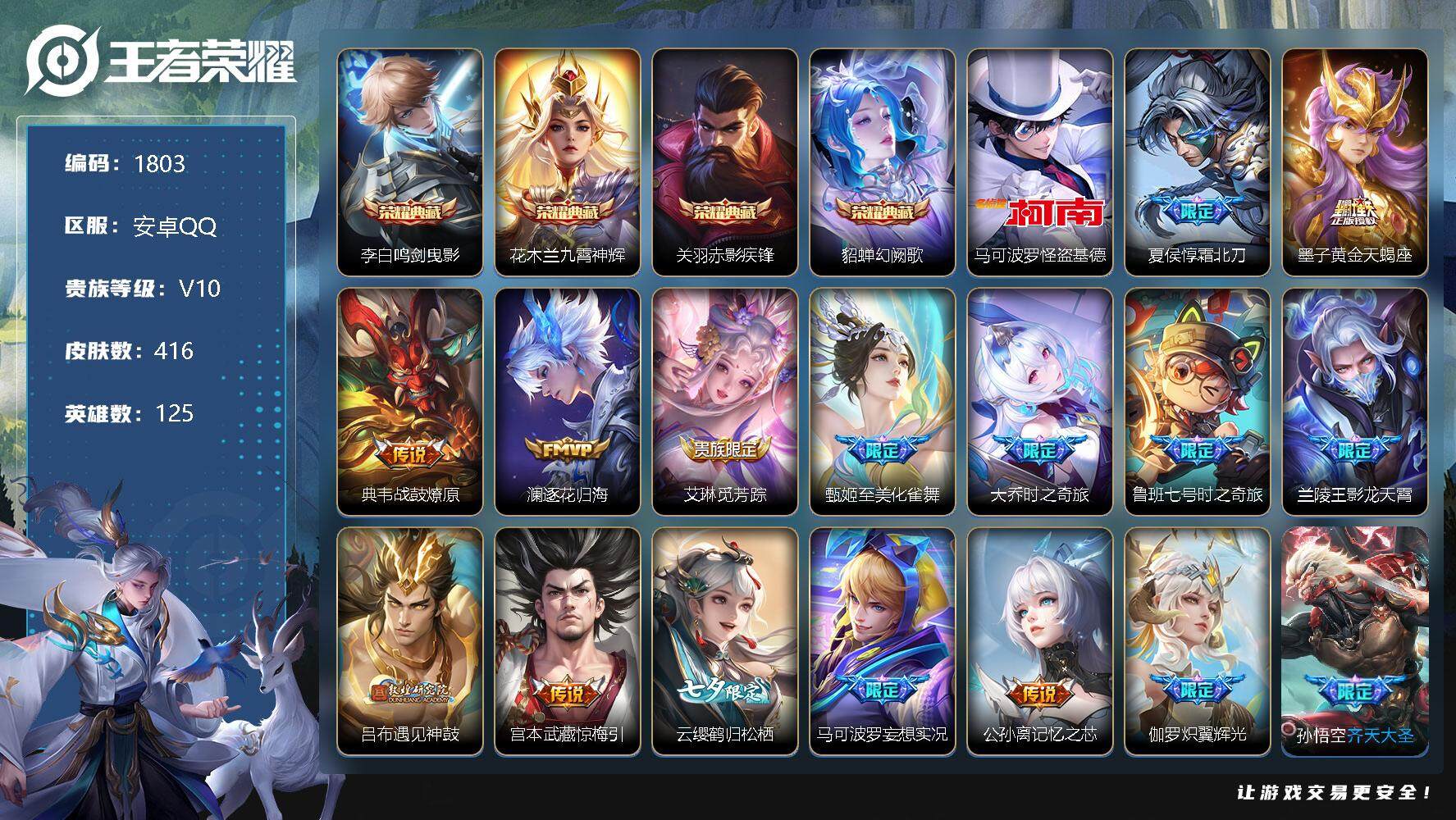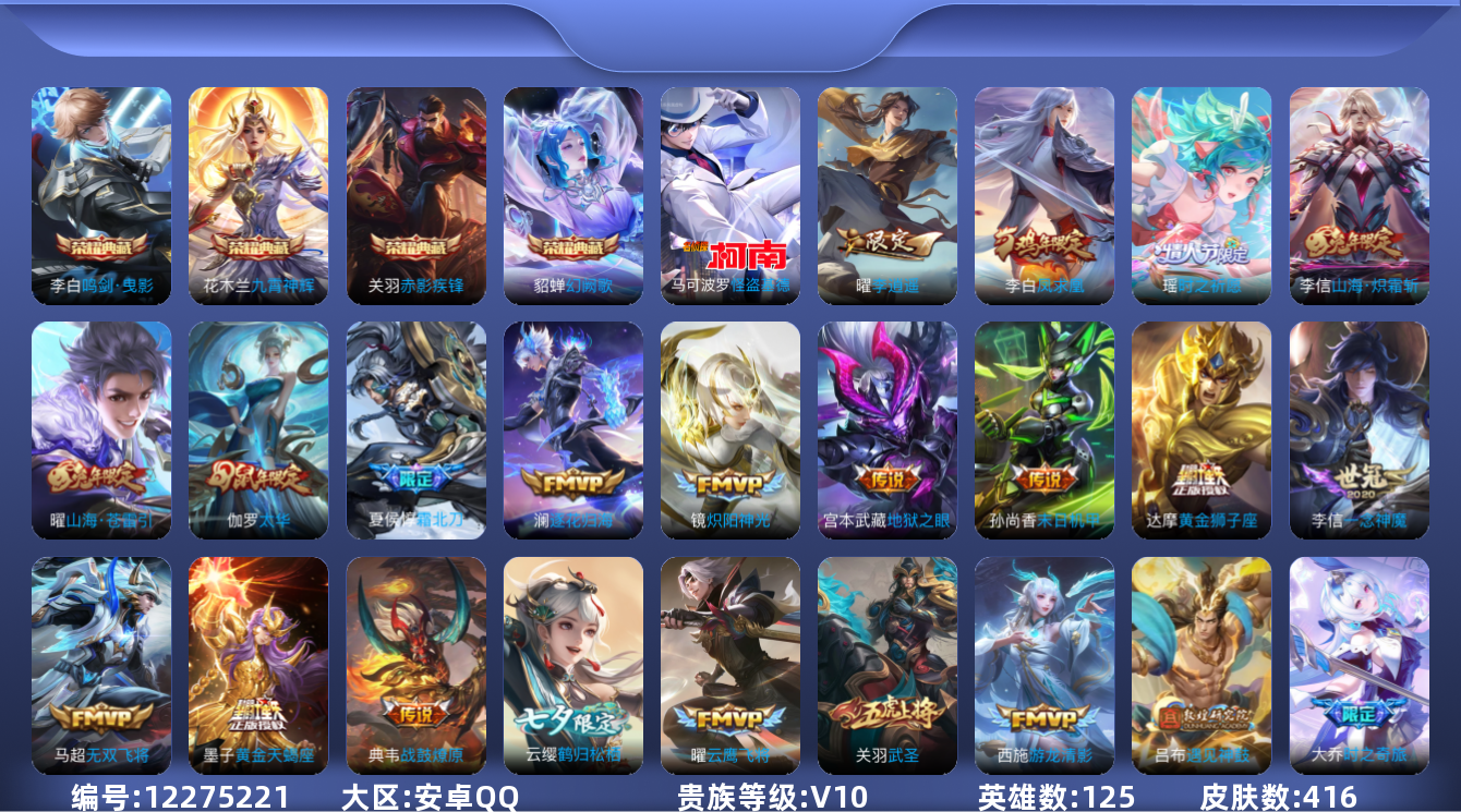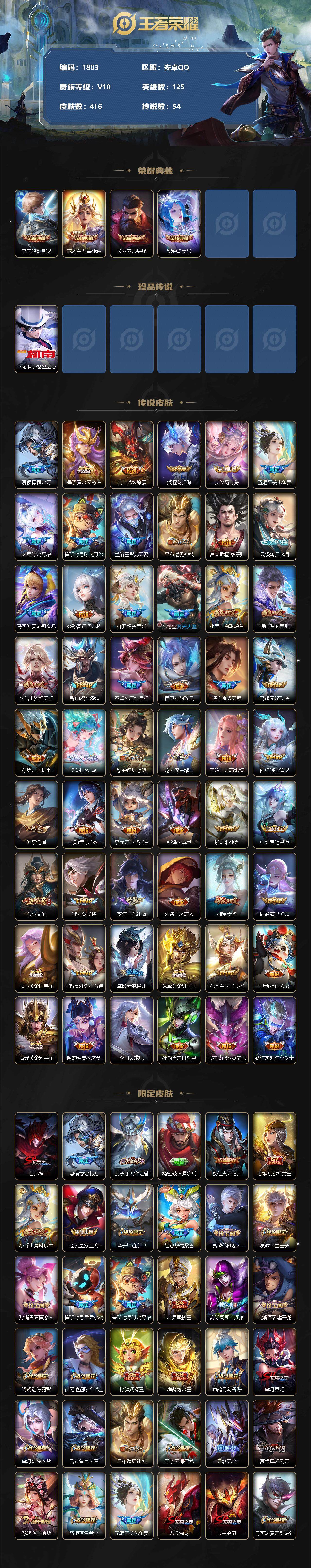 [12275221]【商品标题】:安卓Q-V10-永恒钻石II段位-125英雄-416皮肤-4典藏-0珍品无双-0无双-1珍品传说-54传说-124史诗