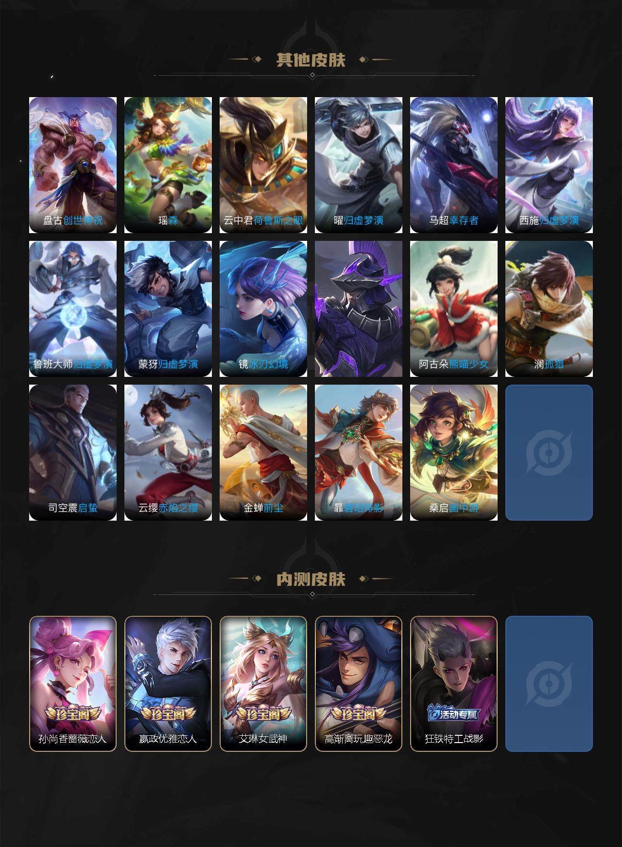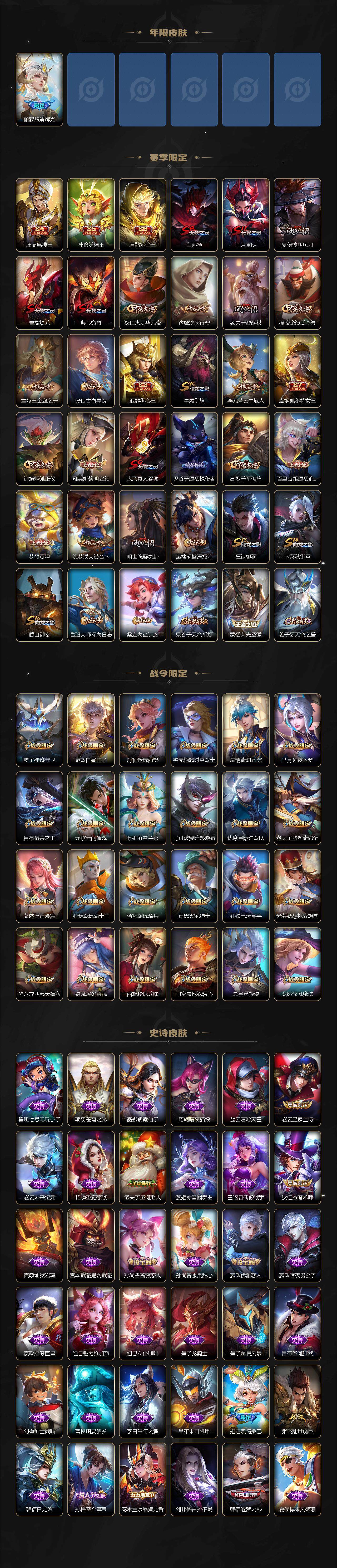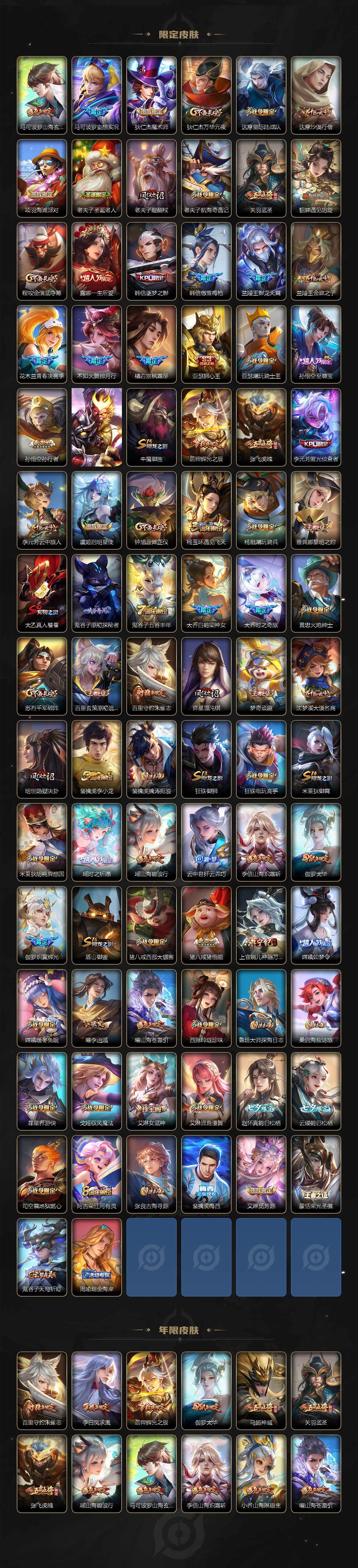 【限定皮肤】:白起狰,夏侯惇霜北刀,姜子牙天穹之誓,杨戬破阵退雄兵,狄仁杰阴阳师,虞姬凯尔特女王,小乔山海琳琅生,赵云皇家上将,墨子神迹守卫,妲己热情桑巴,嬴政优雅恋人,嬴政白昼王子,孙尚香蔷薇恋人,鲁班七号乒乒小将,鲁班七号时之奇旅,庄周蜃楼王,高渐离死亡摇滚,高渐离玩趣恶龙,阿轲迷踪丽影,钟无艳超时空战士,孙膑妖精王,扁鹊炼金王,扁鹊奇幻香踪,芈月重明,芈月幻夜卜梦,吕布猎兽之王,吕布遇见神鼓,元歌云间偶戏,元歌无心,夏侯惇朔风刀,甄姬游园惊梦,甄姬落雪兰心,甄姬至美化雀舞,曹操烛龙,典韦穷奇,马可波罗暗影游猎,马可波罗山海玄木吟,马可波罗妄想实况,狄仁杰魔术师,狄仁杰万华元夜,达摩星际陆战队,达摩沙漠行僧,项羽海滩派对,老夫子圣诞老人,老夫子醍醐杖,老夫子航海奇遇记,关羽武圣,貂蝉遇见胡旋,程咬金演武夺筹,露娜一生所爱,韩信逐梦之影,韩信傲雪梅枪,兰陵王影龙天霄,兰陵王金庭之子,花木兰青春决赛季,不知火舞绯月行,橘右京枫霜尽,亚瑟狮心王,亚瑟潮玩骑士王,