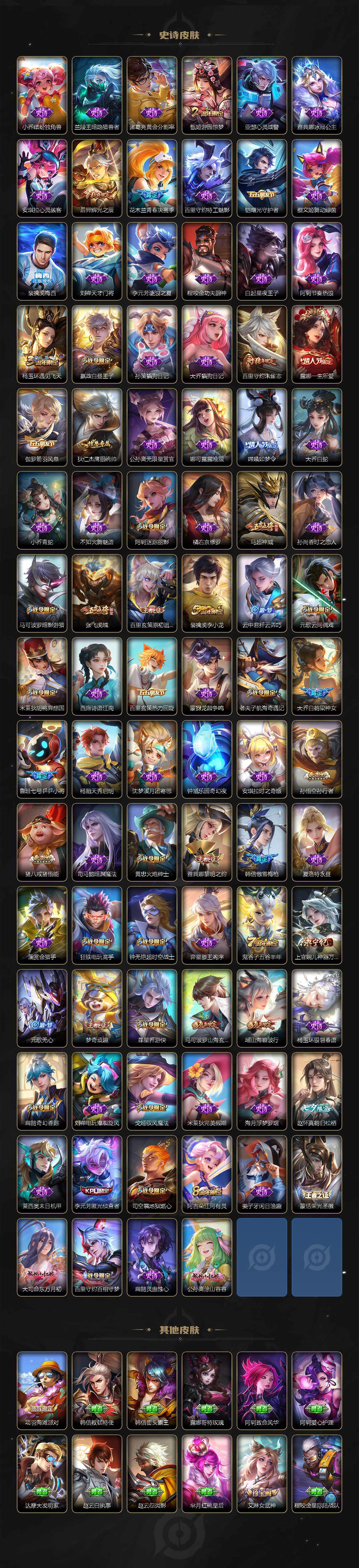裴擒虎李小龙,关羽武圣,张飞虎魄,马超神威,后羿辉光之辰,伽罗太华,韩信逐梦之影,百里守约朱雀志,露娜一生所爱,嫦娥如梦令,孙悟空至尊宝,裴擒虎梅西,妲己热情桑巴,花木兰青春决赛季,鲁班七号乒乒小将,大乔白鹤梁神女,猪八戒猪悟能,老夫子圣诞老人,孙悟空孙行者,韩信傲雪梅枪,瑶时之祈愿,橘右京枫霜尽,不知火舞绯月行,上官婉儿神器·万象笔,马可波罗山海·玄木吟,瑶山海·碧波行,兰陵王影龙天霄,甄姬至美·化雀舞,夏侯惇霜北刀