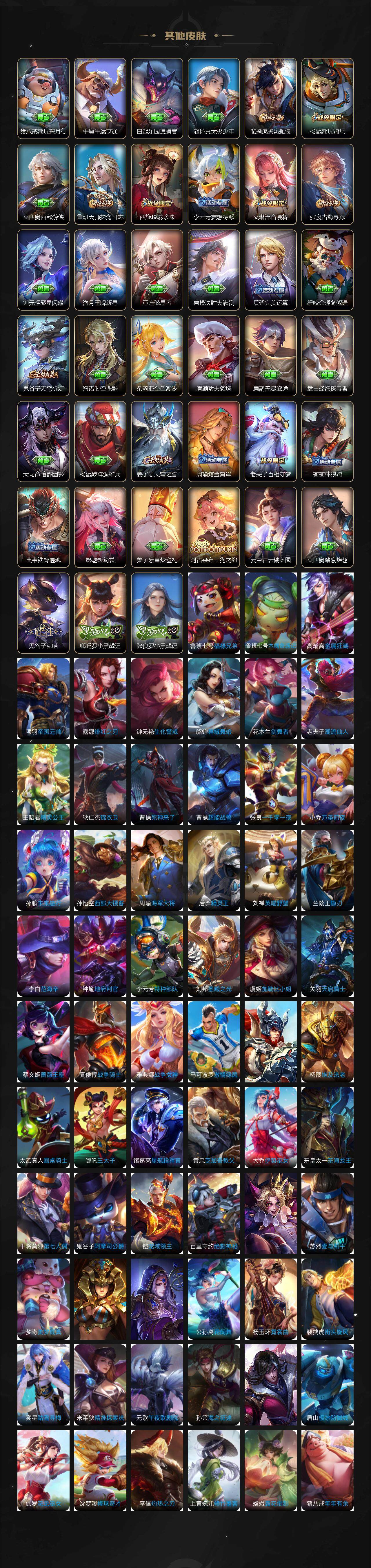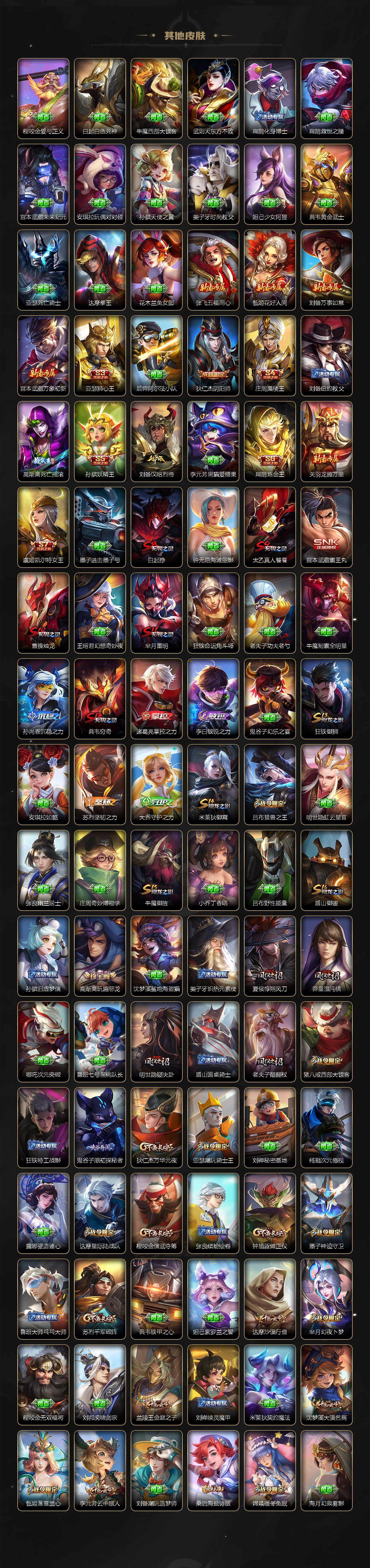 小乔青蛇,大乔白蛇,娜可露露晚萤,伽罗箭羽风息,李元芳逐浪之夏,不知火舞魅语,公孙离无限星赏官,大乔猫狗日记,孙策猫狗日记,阿轲节奏热浪,露娜紫霞仙子,诸葛亮黄金分割率,王昭君偶像歌手,韩信白龙吟,项羽苍穹之光,孙尚香时之恋人,阿轲暗夜猫娘,雅典娜冰冠公主,吕布末日机甲,鲁班七号电玩小子,蒙犽龙鼓争鸣,橘右京修罗,墨子龙骑士,嬴政摇滚巨星,刘禅绅士熊喵,刘禅天才门将,白起星夜王子,安琪拉心灵骇客,安琪拉时之奇旅,程咬金功夫厨神,刘邦德古拉伯爵,兰陵王暗隐猎兽者,曹操幽灵船长,宫本武藏鬼剑武藏,司马懿暗渊魔法,亚瑟心灵战警,钟馗乐园奇幻夜,杨戬天秀·启明,蔡文姬舞动绿茵,廉颇地狱岩魂,西施诗语江南,小乔缤纷独角兽,夏侯惇乘风破浪,花木兰水晶猎龙者,铠曙光守护者,百里玄策热力回旋,墨子金属风暴,百里玄策原初追逐者,吕布圣诞狂欢,貂蝉圣诞恋歌,百里守约特工魅影,嬴政暗夜贵公子,雅典娜黎明之约,李白千年之狐,夏洛特永昼,澜赏金猎手,弈星滕王阁序,杨玉环银翎春语,刘禅电玩·爆裂旋风,海月浮梦罗烟,赵怀真鹤归松栖,莱西奥末日机甲,李元芳匿光侦查者,姜子牙闲日渔趣
