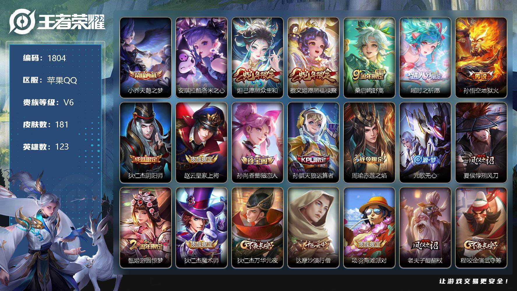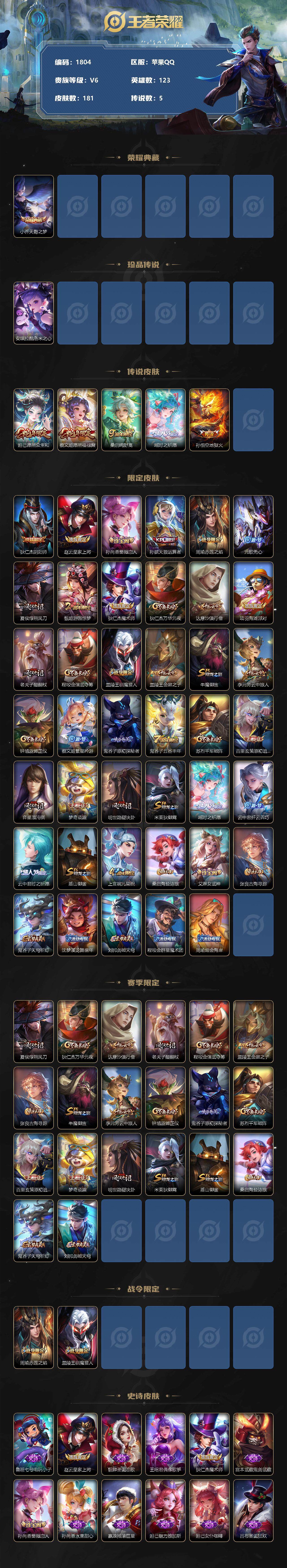 [12275279]【商品标题】:苹果Q-V6-永恒钻石V段位-123英雄-181皮肤-1典藏-0珍品无双-0无双-1珍品传说-5传说-38史诗