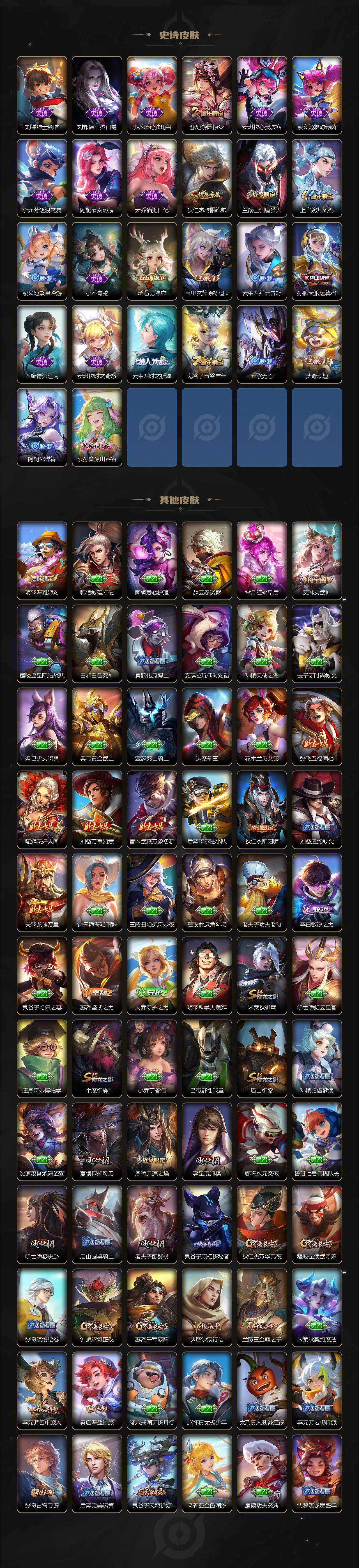 【史诗皮肤】:鲁班七号电玩小子,赵云皇家上将,貂蝉圣诞恋歌,王昭君偶像歌手,狄仁杰魔术师,宫本武藏鬼剑武藏,孙尚香蔷薇恋人,孙尚香水果甜心,嬴政摇滚巨星,妲己魅力维加斯,妲己女仆咖啡,吕布圣诞狂欢,刘禅绅士熊喵,刘邦德古拉伯爵,小乔缤纷独角兽,甄姬游园惊梦,安琪拉心灵骇客,蔡文姬舞动绿茵,李元芳逐浪之夏,阿轲节奏热浪,大乔猫狗日记,狄仁杰鹰眼统帅,兰陵王驯魔猎人,上官婉儿梁祝,蔡文姬繁星吟游,小乔青蛇,瑶遇见神鹿,百里玄策原初追逐者,云中君纤云弄巧,孙膑天狼运算者,西施诗语江南,安琪拉时之奇旅,云中君时之祈愿,鬼谷子五谷丰年,元歌无心,梦奇顽趣,阿轲化蝶舞,公孙离涂山容容