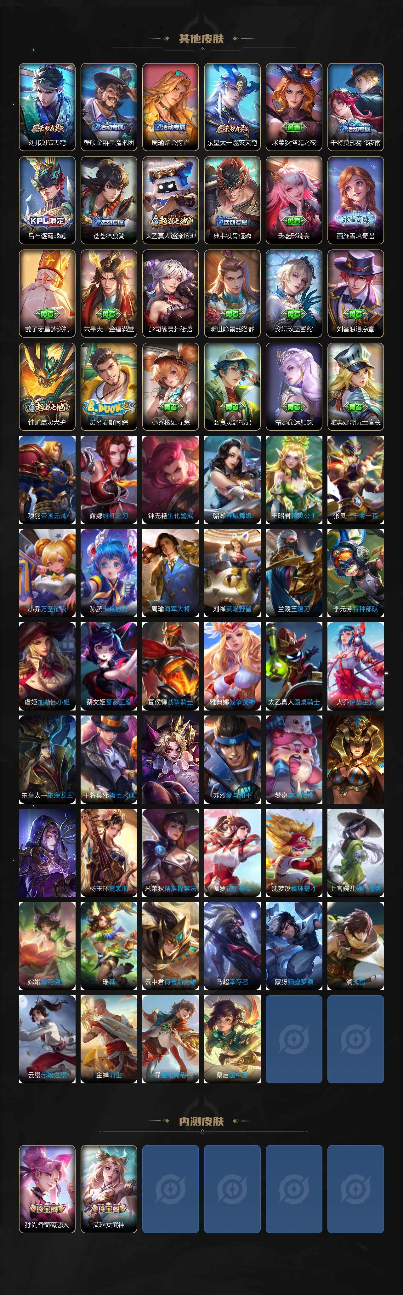 【赛季限定】:夏侯惇朔风刀,狄仁杰万华元夜,达摩沙漠行僧,老夫子醍醐杖,程咬金演武夺筹,兰陵王金庭之子,张良古海寻踪,牛魔御旌,李元芳云中旅人,钟馗驱傩正仪,鬼谷子原初探秘者,苏烈千军破阵,百里玄策原初追逐者,弈星混沌棋,梦奇顽趣,明世隐疑决卦,米莱狄御霄,盾山御銮,桑启海盐诗旅,鬼谷子天穹祈灯,刘邦剑破天穹
