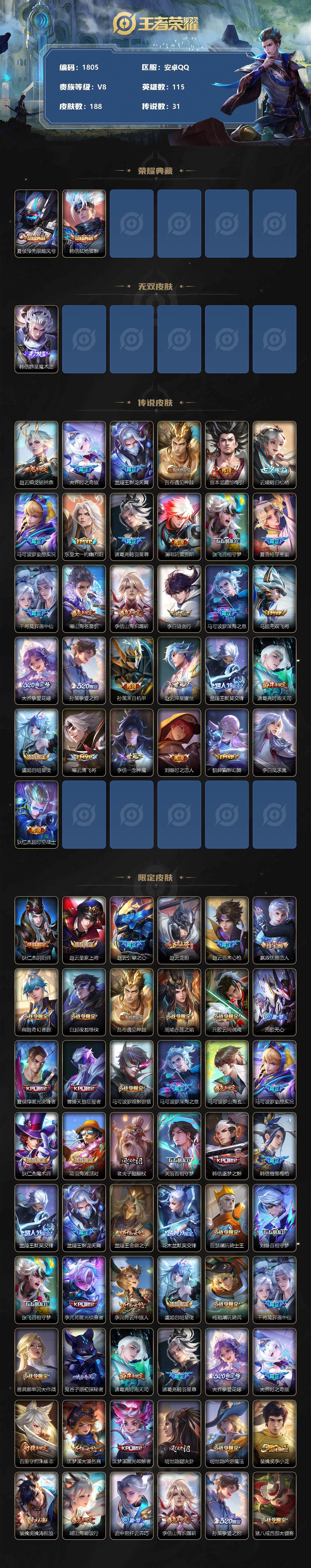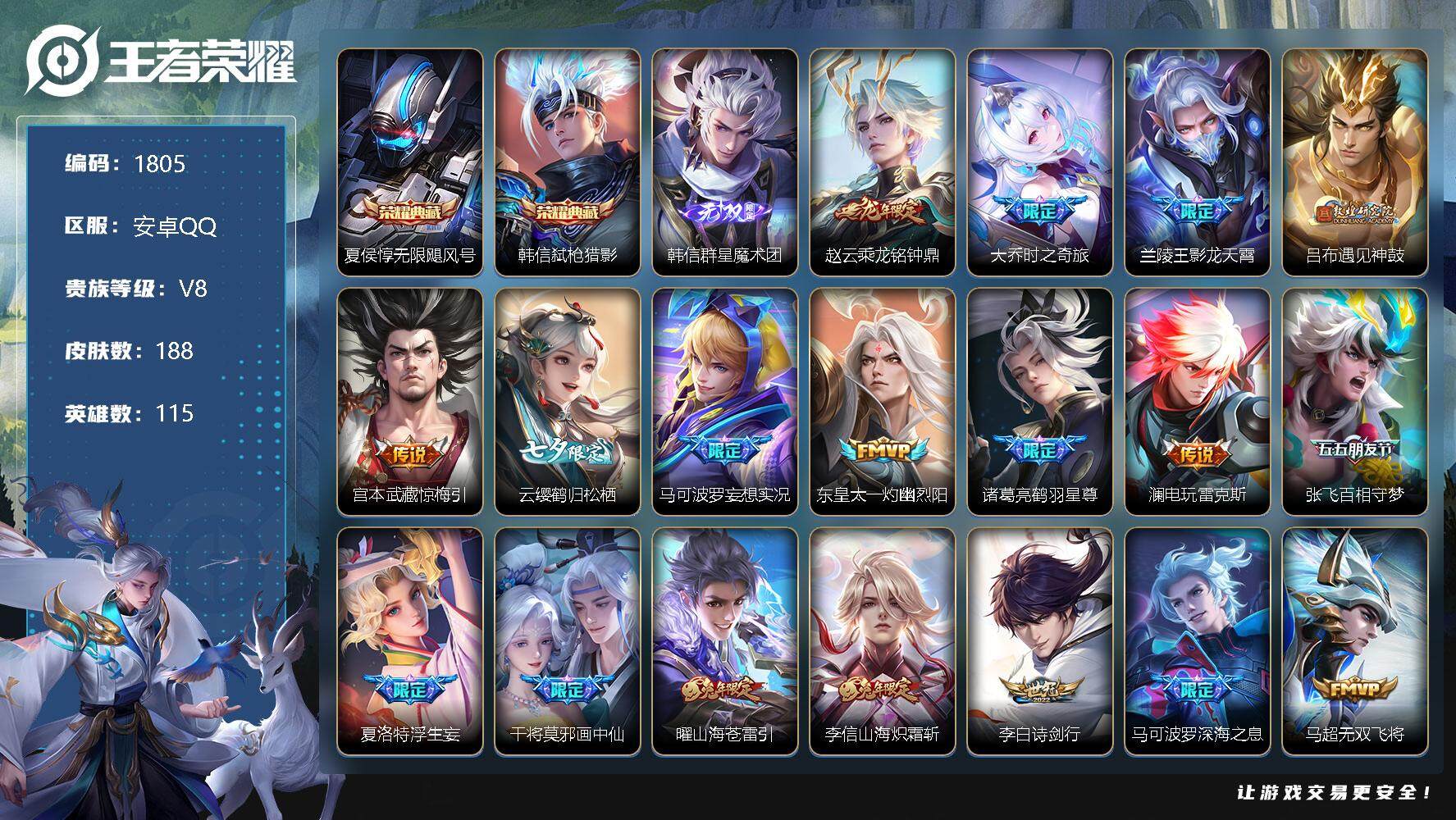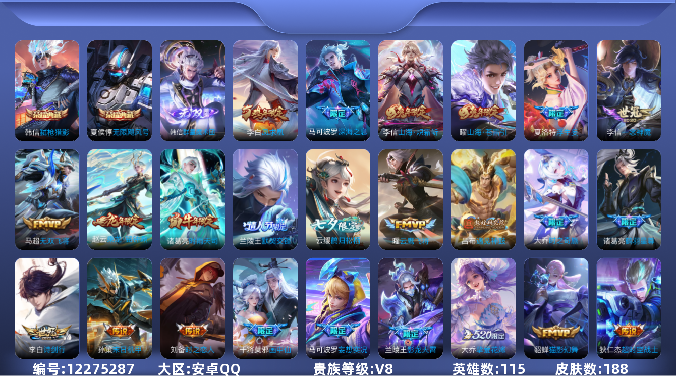 [12275287]【商品标题】:安卓Q-V4-荣耀黄金IV段位-115英雄-188皮肤-2典藏-0珍品无双-1无双-0珍品传说-31传说-61史诗