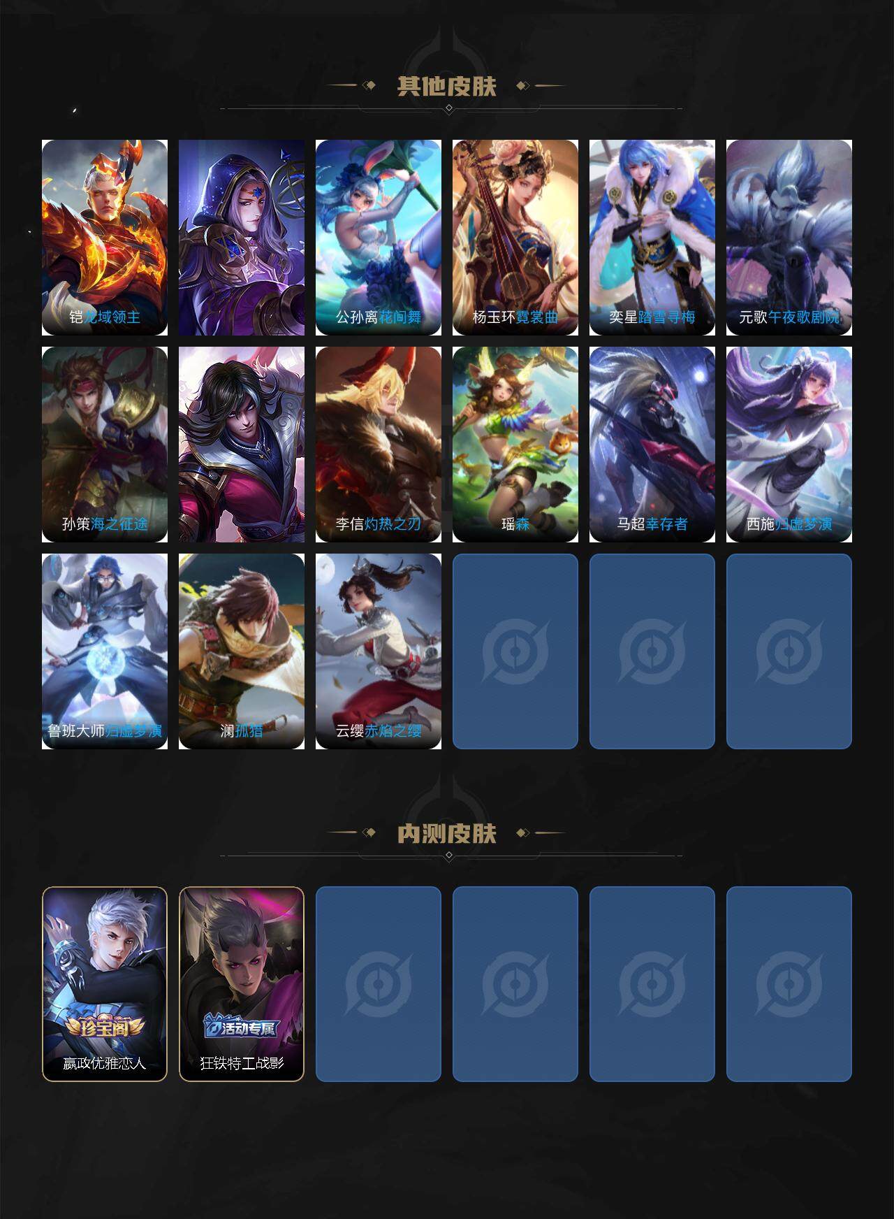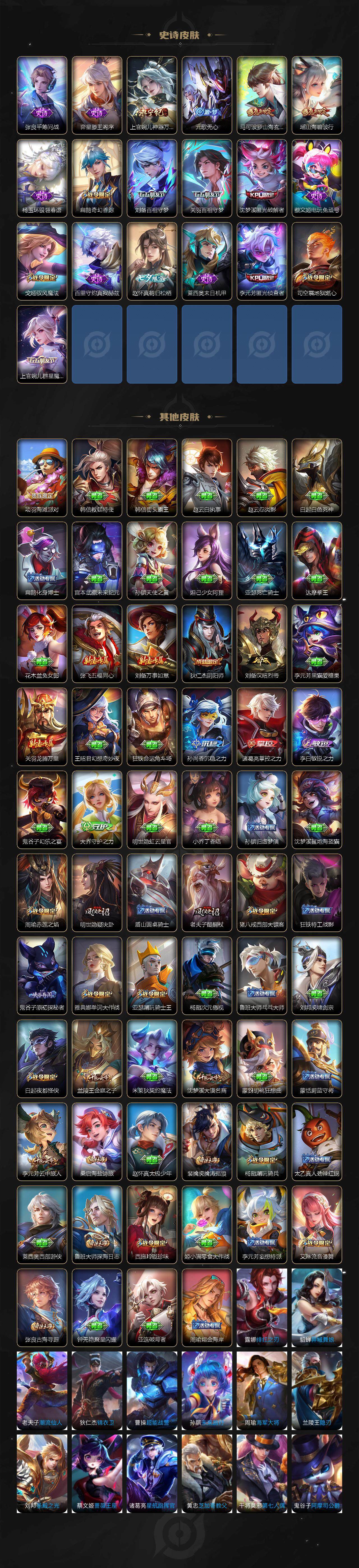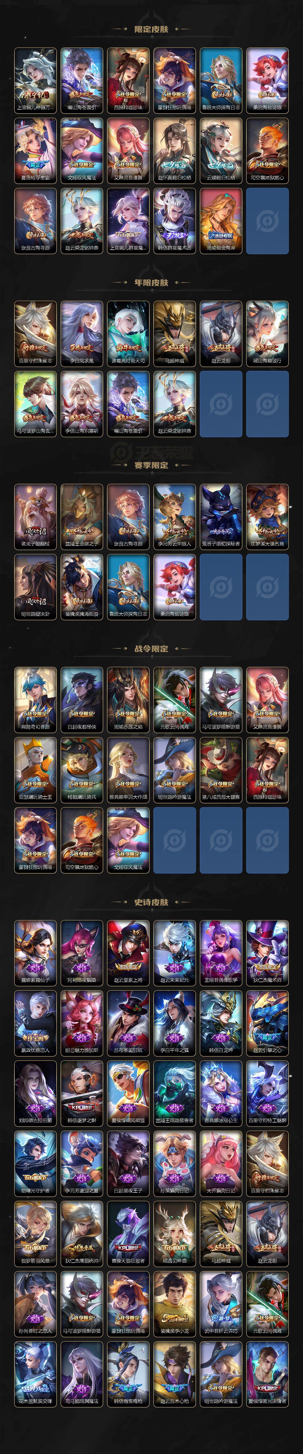 【限定皮肤】:狄仁杰阴阳师,赵云皇家上将,赵云引擎之心,赵云龙胆,赵云百木心枪,嬴政优雅恋人,扁鹊奇幻香踪,白起夜都怪侠,吕布遇见神鼓,周瑜赤莲之焰,元歌云间偶戏,元歌无心,夏侯惇匿光决锋者,曹操天狼征服者,马可波罗暗影游猎,马可波罗深海之息,马可波罗山海玄木吟,马可波罗妄想实况,狄仁杰魔术师,项羽海滩派对,老夫子醍醐杖,关羽百相守梦,韩信逐梦之影,韩信傲雪梅枪,兰陵王默契交锋,兰陵王影龙天霄,兰陵王金庭之子,花木兰默契交锋,亚瑟潮玩骑士王,刘备百相守梦,张飞百相守梦,李元芳匿光侦查者,李元芳云中旅人,虞姬启明星使,杨戬潮玩骑兵,干将莫邪画中仙,雅典娜单词大作战,鬼谷子原初探秘者,诸葛亮时雨天司,诸葛亮鹤羽星尊,大乔挚爱花嫁,大乔时之奇旅,百里守约朱雀志,沈梦溪大漠名商,沈梦溪匿光破解者,明世隐疑决卦,明世隐吟游魔法,裴擒虎李小龙,裴擒虎擒涛扼浪,瑶山海碧波行,云中君纤云弄巧,李信山海炽霜斩,孙策挚爱之约,猪八戒西部大镖客,上官婉儿神器万象笔,曜山海苍雷引,西施玲珑珍味,蒙犽狂想玩偶喵,鲁班大师探海日志,桑启海盐诗旅,夏洛特浮生妄,戈娅驭风魔法,艾琳流音漫舞,赵怀真鹤归松栖,云缨鹤归松栖,司空震地狱燃心,张良古海寻踪,赵云乘龙铭钟鼎,上官婉儿群星魔术团,韩信群星魔术团,周瑜熔金海岸