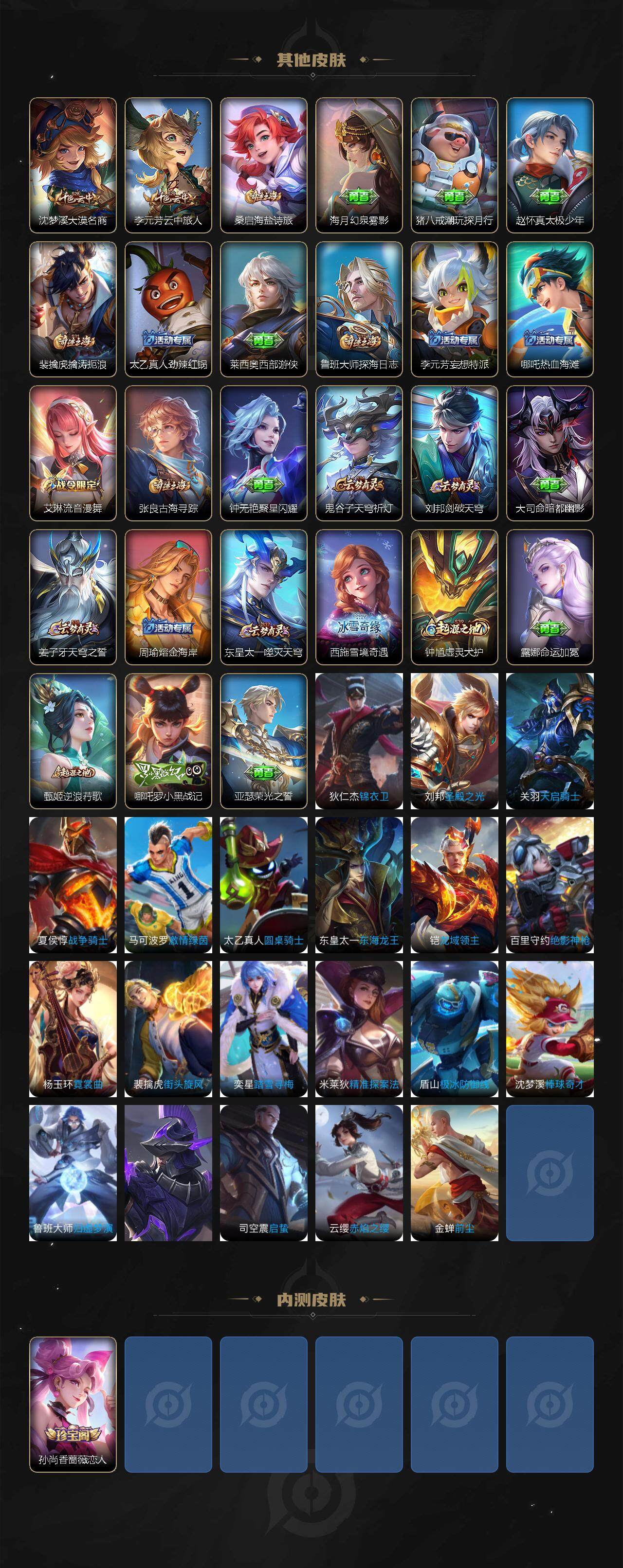 【其他皮肤】:项羽海滩派对,韩信街头霸王,赵云忍炎影,亚瑟死亡骑士,张飞五福同心,宫本武藏万象初新,狄仁杰阴阳师,刘备汉昭烈帝,关羽龙腾万里,钟无艳海滩丽影,王昭君幻想奇妙夜,狂铁命运角斗场,苏烈坚韧之力,小乔丁香结,哪吒次元突破,张良缤纷绘卷,鲁班大师乓乓大师,达摩沙漠行僧,沈梦溪大漠名商,李元芳云中旅人,桑启海盐诗旅,海月幻泉雾影,猪八戒潮玩探月行,赵怀真太极少年,裴擒虎擒涛扼浪,太乙真人劲辣红锅,莱西奥西部游侠,鲁班大师探海日志,李元芳妄想特派,哪吒热血海滩,艾琳流音漫舞,张良古海寻踪,钟无艳聚星闪耀,鬼谷子天穹祈灯,刘邦剑破天穹,大司命暗都幽影,姜子牙天穹之誓,周瑜熔金海岸,东皇太一噬灭天穹,西施雪境奇遇,钟馗虚灵犬护,露娜命运加冕,甄姬逆浪荇歌,哪吒罗小黑战记,亚瑟荣光之誓,狄仁杰锦衣卫,刘邦圣殿之光,关羽天启骑士,