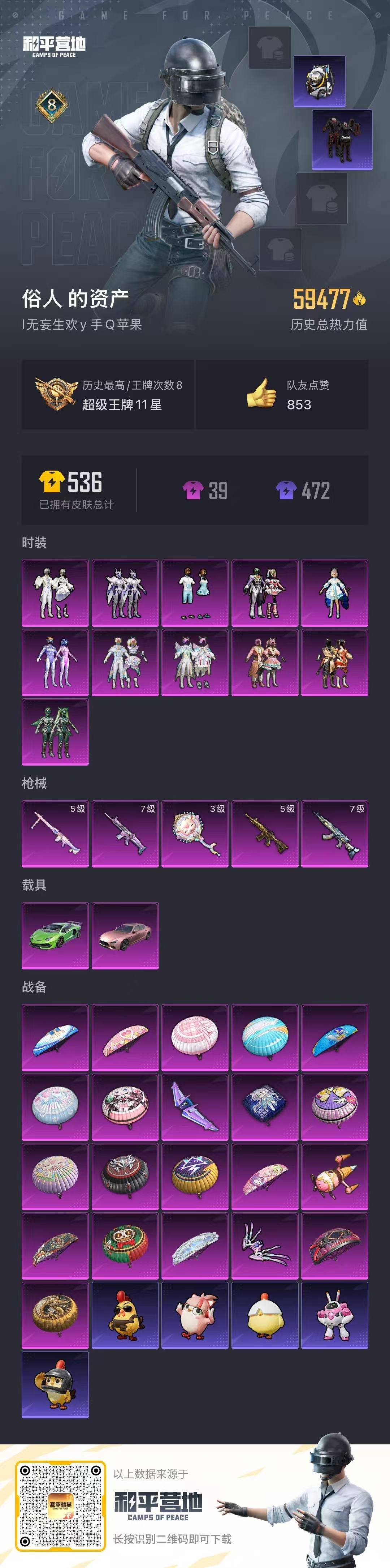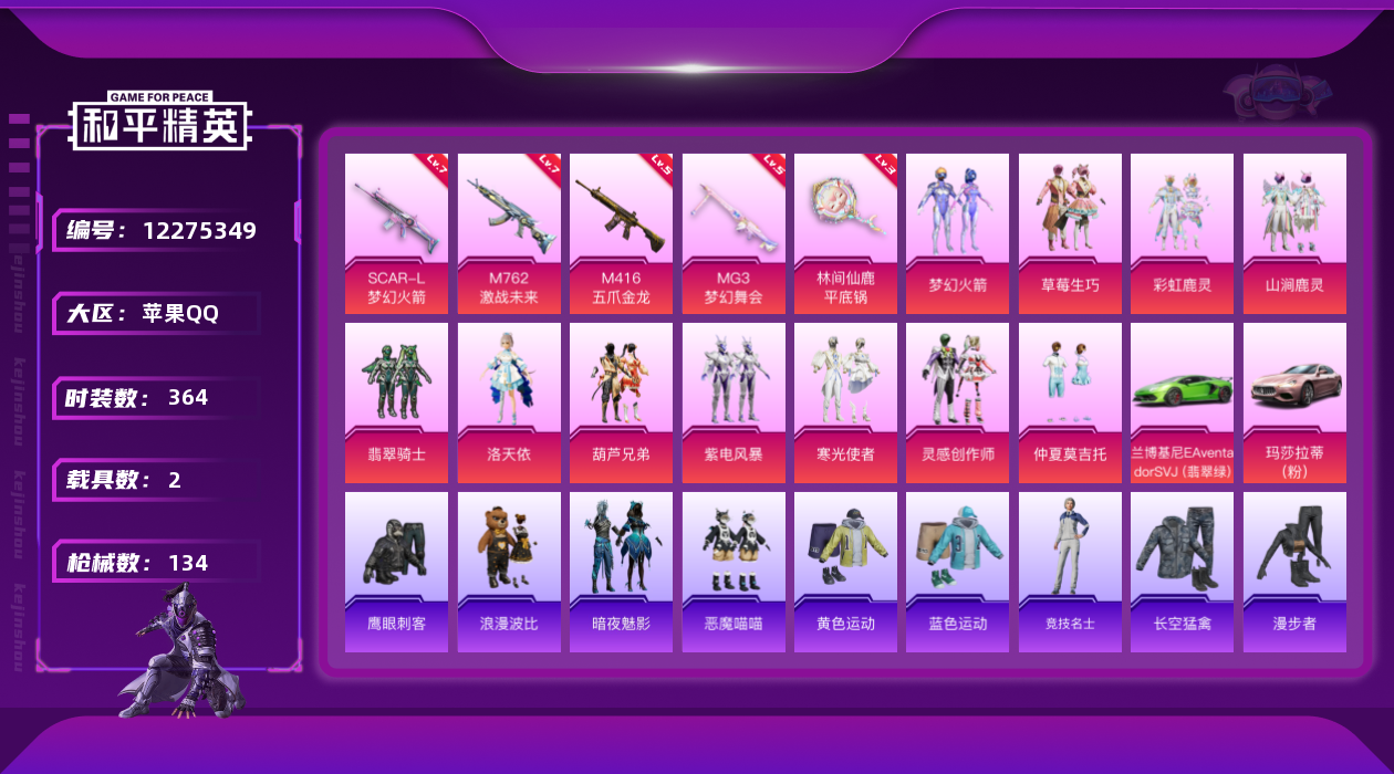 - PX_2100762-??/枪械7/装备227/载具1/战备121/王牌印记6/热力值67189/五级AKM-炫紫旋律/五级AKM-绿萝繁花/五级SCAR-L-锦绣绵绵/五级M416-心之恋语/四级Kar98K-巳巳如意/六级DP-28-暗夜鎏金/四级MG3-酷泡奶龙/玛莎拉蒂粉色/怪诞乔克/甜心巧克力/宝贝奶油派/天使彩虹糖/梦幻火箭/缤纷油彩/放客神游/葫芦兄弟/垂柳戏鸭/暗夜鎏金/阿尔茜/玩