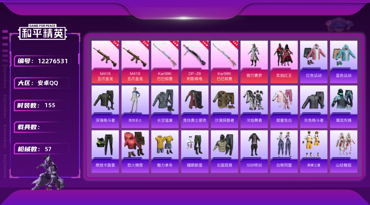 [12276531]2粉装 3特效枪 可二次 可修改实名 优质装备:M416五爪金龙,炙焰红王,银刃赛罗,Kar98K-巳巳如意 稀有枪皮:DP-28-豹影疾电 五级特效枪:五级M416-五爪金龙 四级特效枪:四级M416-五爪金龙,四级Kar98K-巳巳如意 三级特效枪:三级DP-28-豹影疾电 一级特效枪:一级Kar98K-巳巳如意 紫色装扮:幻彩翩翩,SS23特训,妙红点点,SS33特训套装,SS22特训,冷焰舞者,北国孤狼,冰爽海盐,治愈之星,迅捷之星,科技之星,SS14特训,SS20特训,怒火燎原,SS18特训,魅力单车,长空猛禽,深海格斗者,潮流先锋,灰色格斗者,燃烧卡路里,山经魅狐,沙漠探路者,红色运动,耀眼新星,蓝色运动,竞技勇士朋克,甜蜜告白,白熊同盟,诡谋托雷基亚,竞技名士,SS6特训,SS32特训服(SS32特训套装),萌黄之夏,恋语绒绒,光之冒险 优质战备:香水柠檬降落伞,飞行器-激战未来