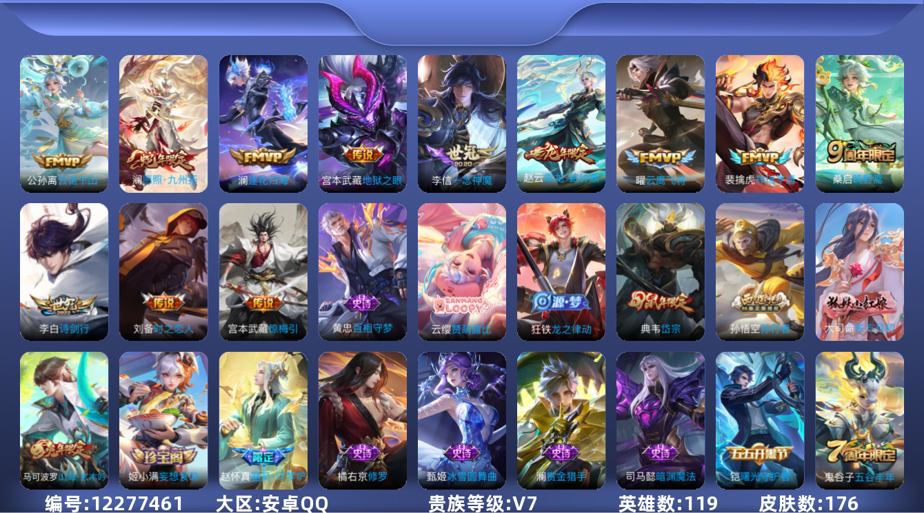 [12277461]V7 12传说 119英雄 176皮肤 可修改实名 优质装备:云鹰飞将(小将军),一念神魔,地狱之眼,时之恋人-刘备(电焊工),惊梅引,澜逐花归海 传说皮:乘龙·铭钟鼎(赵云年限),云诺千山,祥瑞亨通 珍宝阁皮:妄想食味 限定皮:愿照·九州拓(澜年限),鸣野蒿,诗剑行,五谷丰年,岱宗(典韦年限),孙行者,山海·玄木吟(马可年限) 史诗皮:赞萌露比,器灵·浮梦炉,星界战将,龙之律动,东方月初,蒙犽顽岩魄,芈月浮光幕影,上官婉儿群星魔术团,星界特工,百相守梦-黄忠,黄金分割率,江河有灵,百解令(蒙犽),乱世虎臣,修罗,摇滚巨星,水果甜心,绅士熊喵,功夫厨神,德古拉伯爵,暗隐猎兽者,鬼剑武藏,暗渊魔法,天秀·启明,纤云弄巧,缤纷独角兽,水晶猎龙者,曙光守护者,鹰眼统帅,暗夜贵公子,魅力维加斯,赏金猎手