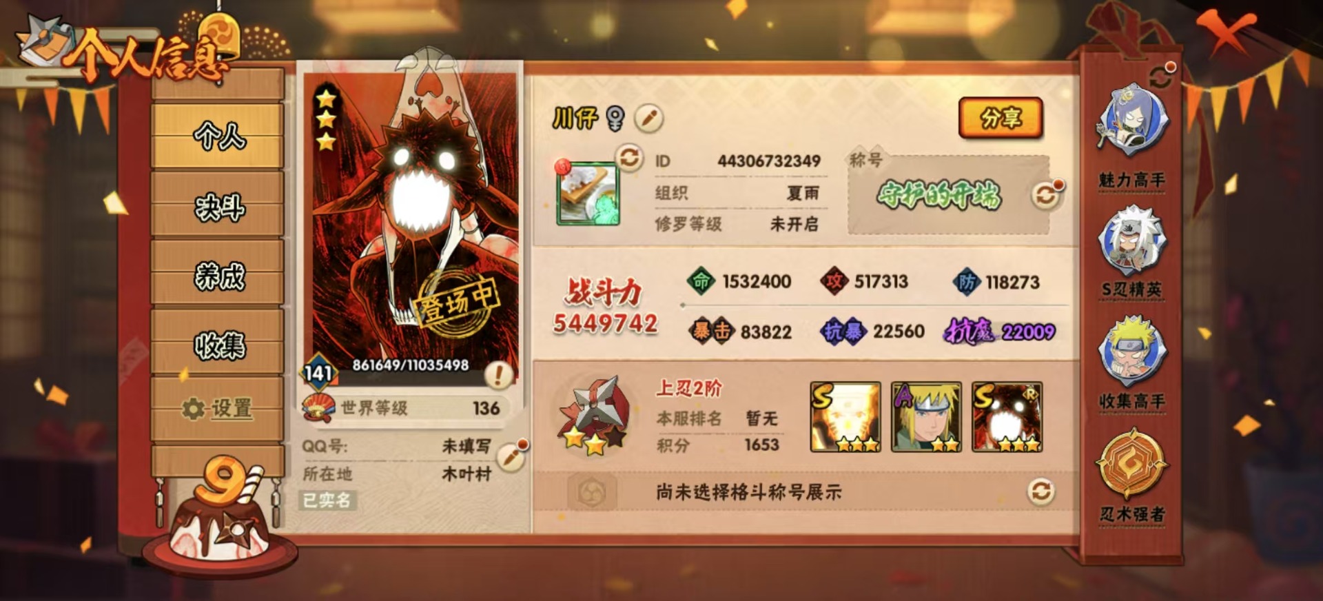[12277509]V10 16S忍 26A忍 16通灵 544.9W战力 可二次 可修改实名 优质装备:宇智波鼬「秽土转生」,漩涡鸣人 「九喇嘛连结」,宇智波佐助「永恒万花筒」,千手柱间·木叶创立,宇智波斑「秽土转生·解」,大筒木桃式,艾「忍界大战」,宇智波止水「须佐能乎」,旗木卡卡西「须佐能乎」,大筒木舍人 「最终章」,漩涡鸣人 「暴怒·第六尾」 S级忍者:自来也 「舞之豪杰」,宇智波鼬 「须佐能乎」,佩恩「天道」,波风水门,大蛇丸