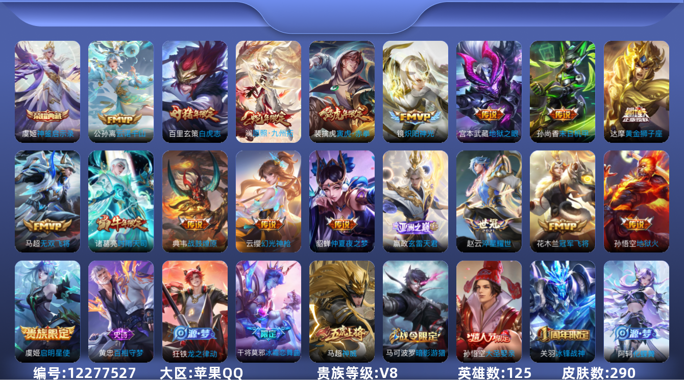 [12277527]V8 1典藏 18传说 125英雄 290皮肤 可修改实名 优质装备:神鉴启示录,黄金狮子座,冠军飞将,炽阳神光,末日机甲-孙尚香(绿蚂蚱),地狱火,仲夏夜之梦(大飞蛾),地狱之眼,淬星耀世,无双飞将,玄雷天君 传说皮:典韦战鼓燎原,云诺千山,幻光神枪 珍宝阁皮:万物之道,女武神 限定皮:愿照·九州拓(澜年限),白虎志(电光耗子),时雨天司(水龙头),神威(电光马子),遇见飞天,高山流水,冰锋战神,游园惊梦,逐梦之星,逐梦之音,李小龙,辉光之辰,霸王别姬-虞姬,真爱至上,大圣娶亲,冰霜恋舞曲,匿光追影者,寅虎·赤拳(老虎年限) 史诗皮:苍鳞隐世,糖绘人间,狼魂孤将,化蝶舞,星界战将,龙之律动,百相守梦-百里守约,百相守梦-黄忠,紫霞仙子,苍穹之光,黄金分割率,千年之狐,江河有灵,魅语,百解令(蒙犽),冰冠公主,偶像歌手,晚萤,龙骑士(小龙虾),末日机甲-吕布,猫狗日记-孙策,乱世虎臣,节奏热浪,修罗,女仆咖啡,摇滚巨星,水果甜心,天才门将,星夜王子,心灵骇客,德古拉伯爵,暗隐猎兽者,幽灵船长,鬼剑武藏,天秀·启明,舞动绿茵,地狱岩魂,纤云弄巧,繁星吟游(呼啦呼啦),拒霜思,缤纷独角兽,乘风破浪,水晶猎龙者,金属风暴,原初追逐者,圣诞狂欢,圣诞恋歌,鹰眼统帅,王者之锤,暗夜贵公子,魅力维加斯,黎明之约,未来纪元-赵云