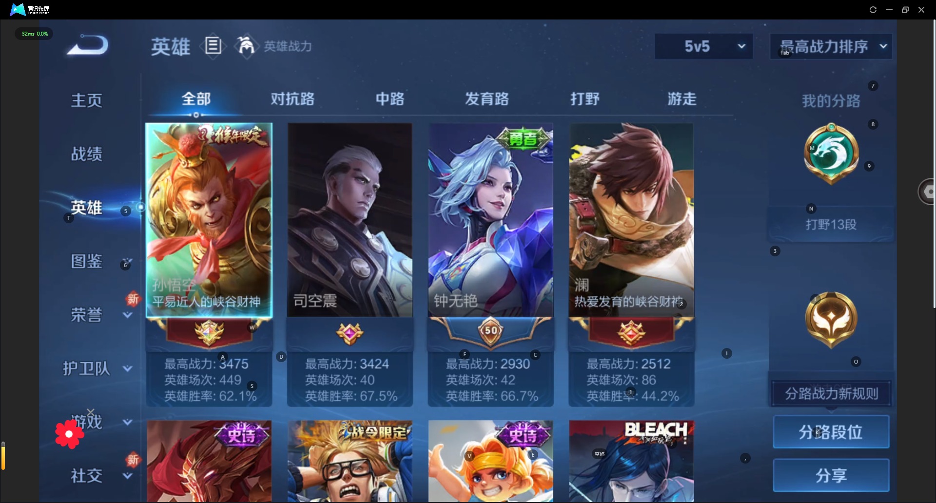 - PX_2088960-实名: 可修改 贵族等级: V8 英雄数: 123 皮肤数: 273 荣耀水晶: 鸣剑·曳影 无双皮: 器灵·螭龙剑 珍品传说: 怪盗基德,器灵·落星盏 星传说: 幽冥之眼 传说皮: 黄金白羊座,炽阳神光,云霓雀翎,地狱之眼,胖达荣荣,李逍遥,音你闪耀,浮生妄,霜月吟,星之鸣奏 限定皮: 冰锋战神,遇见飞天,李小龙,游园惊梦,梁祝,神威,冰霜恋舞曲,逐梦之影,至尊宝,霸王别姬