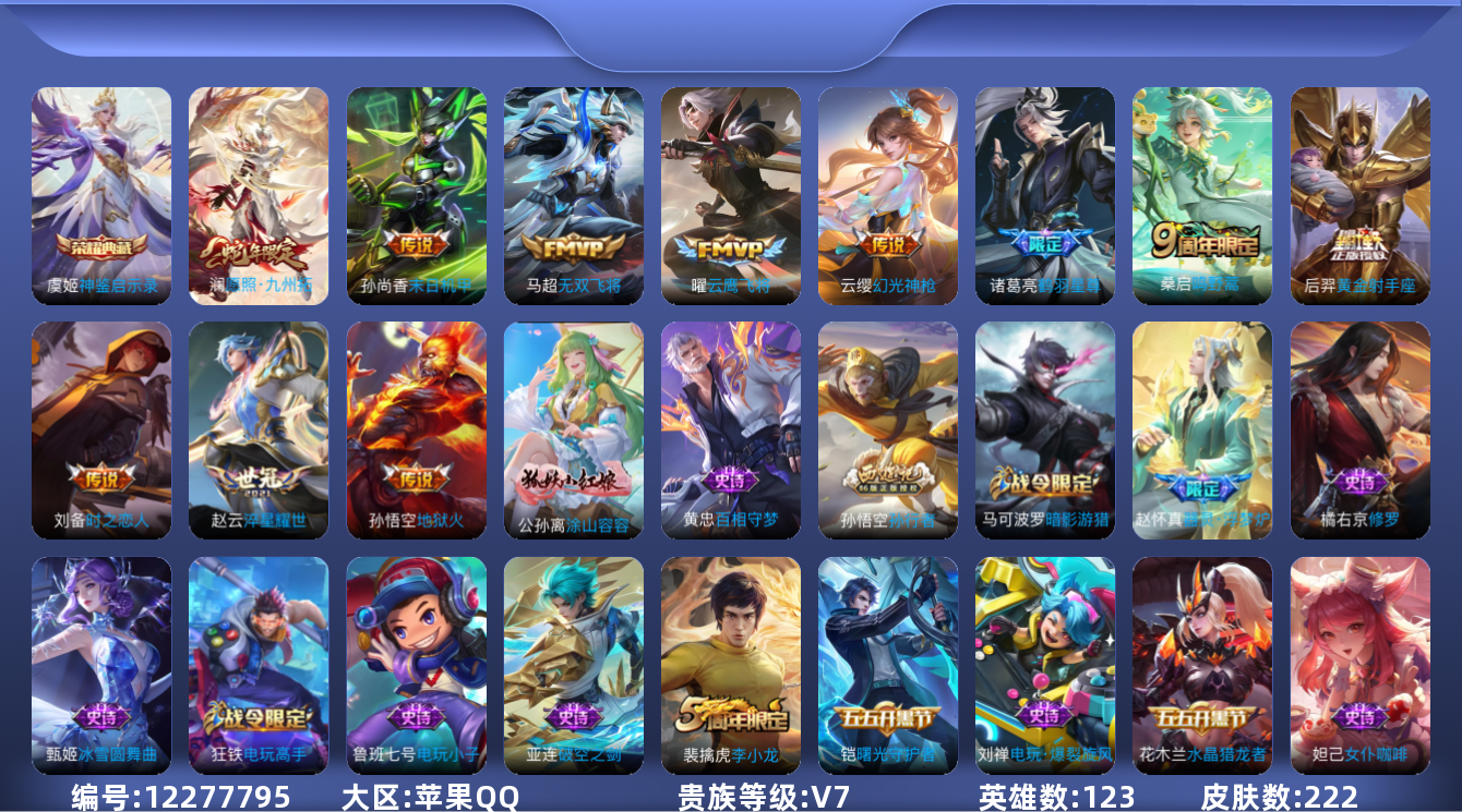 [12277795]V7 1典藏 11传说 123英雄 222皮肤 可修改实名 优质装备:神鉴启示录,黄金射手座,云鹰飞将(小将军),末日机甲-孙尚香(绿蚂蚱),地狱火,时之恋人-刘备(电焊工),淬星耀世,无双飞将,鹤羽星尊,涂山容容 传说皮:幻光神枪 珍宝阁皮:玩趣恶龙 限定皮:愿照·九州拓(澜年限),逐霄战戟,鸣野蒿,李小龙,孙行者 史诗皮:器灵·浮梦炉,茶境仙,破空之剑,百相守梦-百里守约,百相守梦-黄忠,电玩小子(小书包),黄金分割率,特工魅影,千年之狐,冰冠公主,偶像歌手,电玩·爆裂旋风,猫狗日记-孙策,猫狗日记-大乔,修罗,女仆咖啡,水果甜心,星夜王子,心灵骇客,功夫厨神,德古拉伯爵,暗隐猎兽者,鬼剑武藏,心灵战警,天秀·启明,舞动绿茵,地狱岩魂,纤云弄巧,繁星吟游(呼啦呼啦),乘风破浪,月团寄思,水晶猎龙者,曙光守护者,金属风暴,圣诞狂欢,圣诞恋歌,鹰眼统帅,暗夜贵公子,魅力维加斯,未来纪元-赵云