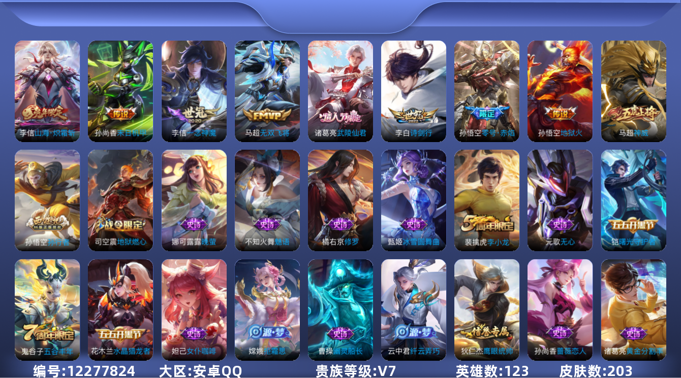 [12277824]V7 8传说 123英雄 203皮肤 可修改实名 优质装备:一念神魔,末日机甲-孙尚香(绿蚂蚱),地狱火,零号·赤焰,无双飞将,山海·炽霜斩(李信年限) 珍宝阁皮:万物之道,蔷薇恋人,玩趣恶龙 限定皮:武陵仙君(小桃花),神威(电光马子),高山流水,诗剑行,五谷丰年,梁祝,李小龙,孙行者 史诗皮:黄金分割率,特工魅影,江河有灵,魅语,蒙恬荣光圣徽,冰冠公主,晚萤,龙骑士(小龙虾),猫狗日记-孙策,乱世虎臣,节奏热浪,修罗,女仆咖啡,摇滚巨星,水果甜心,绅士熊喵,天才门将,功夫厨神,德古拉伯爵,暗隐猎兽者,幽灵船长,鬼剑武藏,纤云弄巧,拒霜思,逐浪之夏,水晶猎龙者,曙光守护者,热力回旋,金属风暴,原初追逐者,圣诞狂欢,鹰眼统帅,魅力维加斯,黎明之约,无心