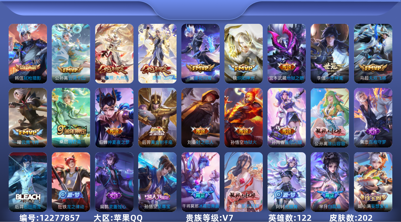 [12277857]V7 1典藏 15传说 122英雄 202皮肤 可修改实名 优质装备:弑枪猎影(韩信典藏),黄金射手座,云鹰飞将(小将军),炽阳神光,一念神魔,地狱火,仲夏夜之梦(大飞蛾),地狱之眼,时之恋人-刘备(电焊工),无双飞将,音你闪耀(rap皮),澜逐花归海,涂山容容 传说皮:云诺千山 珍宝阁皮:妄想食味,蔷薇恋人 限定皮:愿照·九州拓(澜年限),愿照·山河定(司空震年限),鸣野蒿,至尊宝,白晶晶,高山流水,五谷丰年,李小龙,冰霜恋舞曲 史诗皮:器灵·浮梦炉,化蝶舞,灵蛊蚀心,星界战将,龙之律动,石田雨龙,怒海争锋,破空之剑,东方月初,芈月浮光幕影,上官婉儿群星魔术团,百相守梦-百里守约,星界特工,百相守梦-黄忠,紫霞仙子,永昼,江河有灵,百解令(蒙犽),高渐离燃音魔法,蒙恬荣光圣徽,无限星赏官,末日机甲-吕布,猫狗日记-孙策,时之恋人-孙尚香,节奏热浪,水果甜心,天才门将,星夜王子,功夫厨神,德古拉伯爵,暗隐猎兽者,幽灵船长,鬼剑武藏,暗渊魔法,心灵战警,舞动绿茵,地狱岩魂,乘风破浪,水晶猎龙者,曙光守护者,箭羽风息,金属风暴,原初追逐者,圣诞狂欢,鹰眼统帅,魅力维加斯,黎明之约,未来纪元-赵云