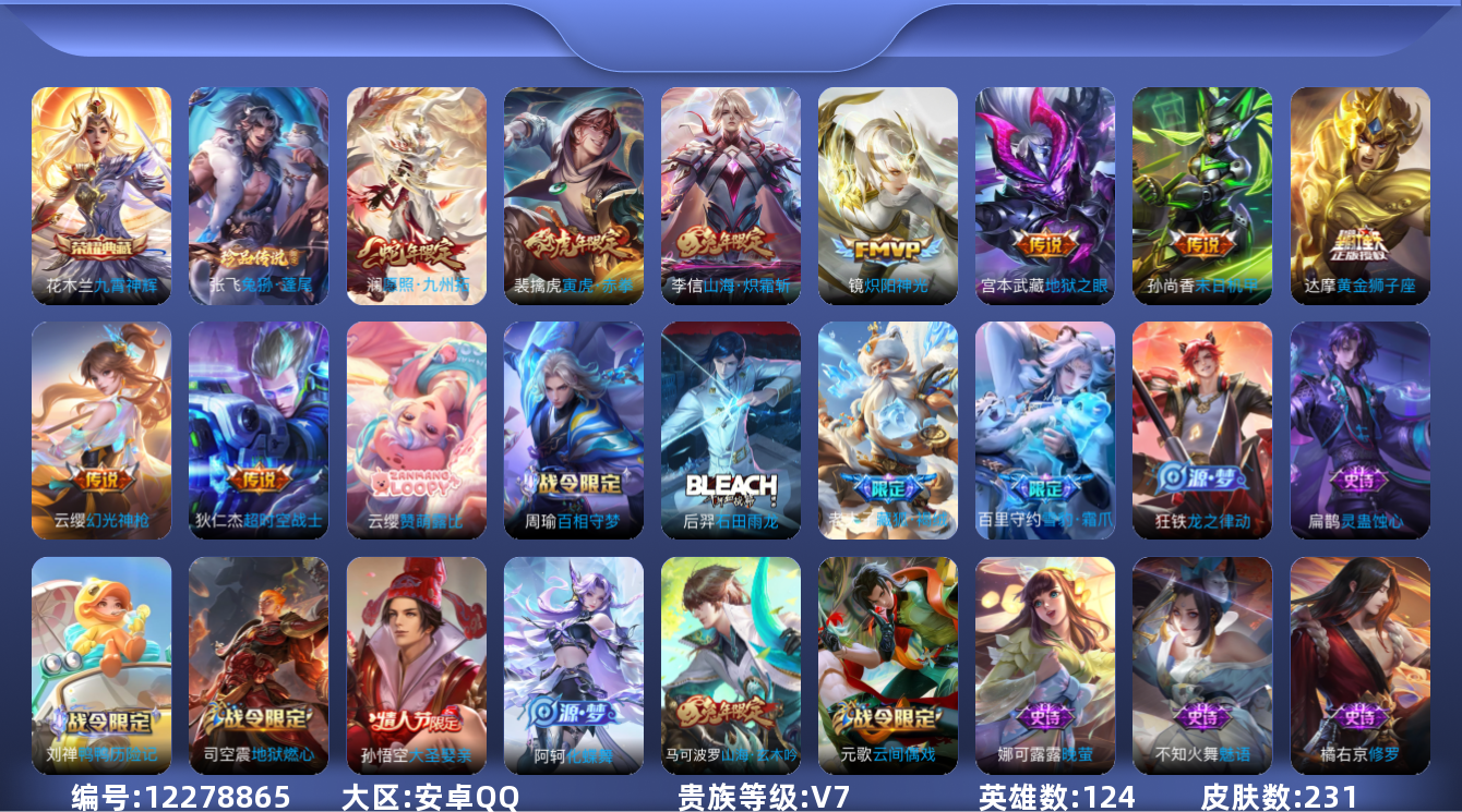 [12278865]【商品标题】:安卓Q-V7-最强王者段位-124英雄-231皮肤-1典藏-0珍品无双-0无双-1珍品传说-9传说-73史诗