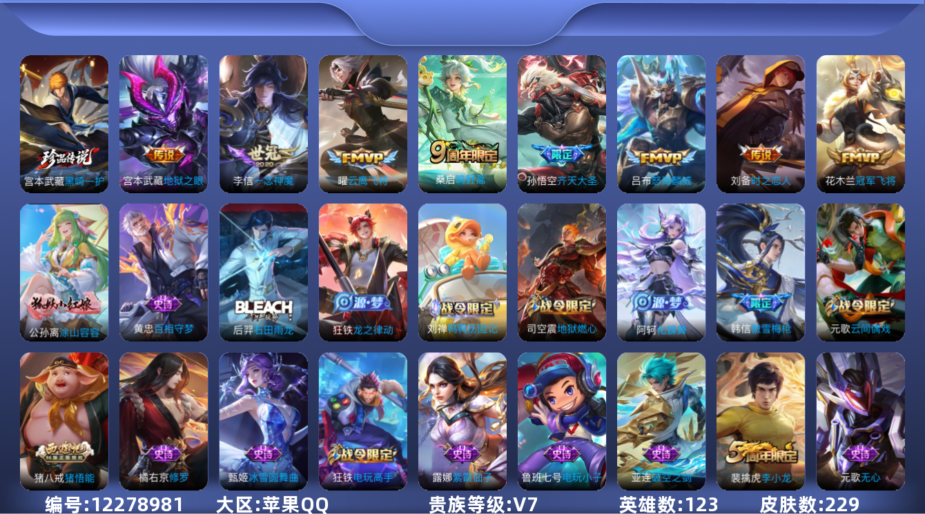 [12278981]V7 1珍品传说 8传说 123英雄 229皮肤 可修改实名 优质装备:黑崎一护,冠军飞将,云鹰飞将(小将军),一念神魔,地狱之眼,时之恋人-刘备(电焊工),涂山容容 珍宝阁皮:万物之道,玩趣恶龙 限定皮:逐霄战戟,鸣野蒿,傲雪梅枪,高山流水,齐天大圣,怒海麟威,五谷丰年,李小龙,猪悟能 史诗皮:鸭鸭历险记-刘禅,化蝶舞,龙之律动,石田雨龙,茶境仙,破空之剑,超元猎域,星界特工,百相守梦-黄忠,紫霞仙子,电玩小子(小书包),黄金分割率,特工魅影,千年之狐,江河有灵,蒙恬荣光圣徽,末日机甲-吕布,猫狗日记-孙策,猫狗日记-大乔,乱世虎臣,修罗,女仆咖啡,摇滚巨星,水果甜心,绅士熊喵,天才门将,功夫厨神,幽灵船长,鬼剑武藏,暗渊魔法,心灵战警,舞动绿茵,乘风破浪,逐浪之夏,曙光守护者,箭羽风息,金属风暴,圣诞狂欢,圣诞恋歌,鹰眼统帅,无心,未来纪元-赵云