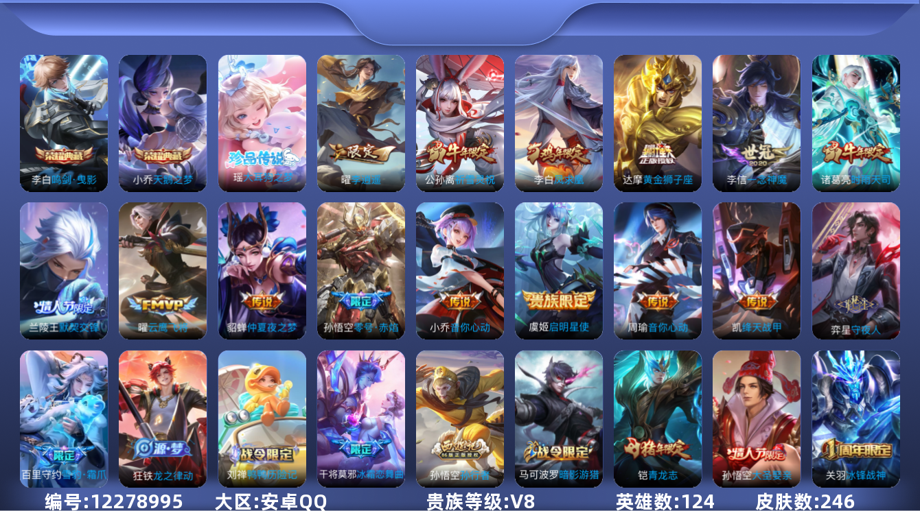 [12278995]V8 2典藏 1珍品传说 14传说 124英雄 246皮肤 可修改实名 优质装备:天鹅之梦(小乔典藏),鸣剑·曳影,大耳狗之梦,黄金狮子座,云鹰飞将(小将军),绛天战甲(鸡嘴战神),一念神魔,仲夏夜之梦(大飞蛾),音你心动-小乔,零号·赤焰,音你心动-周瑜,李逍遥 珍宝阁皮:优雅恋人,女武神 限定皮:凤求凰(白切鸡),凤凰于飞,白鹤梁神女,白晶晶,时雨天司(水龙头),高山流水,五谷丰年,青龙志(铠年限),冰锋战神,天狼运算者,梁祝,御风骁将(吕布年限),天狼溯光者,奔雷神使(牛魔年限),祈雪灵祝(雪兔子),李小龙,逐梦之影,霸王别姬-项羽,霸王别姬-虞姬,默契交锋-兰陵王,默契交锋-花木兰,孙行者,猪悟能,大圣娶亲,引擎之心,冰霜恋舞曲,乒乒小将,神奇女侠,时之奇旅-妲己 史诗皮:鸭鸭历险记-刘禅,化蝶舞,龙之律动,雪豹·霜爪,茶境仙,守夜人,遇见神鹿,紫霞仙子,电玩小子(小书包),特工魅影,千年之狐,魅语,百解令(蒙犽),冰冠公主,偶像歌手,猫狗日记-孙策,时之恋人-孙尚香,乱世虎臣,节奏热浪,修罗,女仆咖啡,摇滚巨星,水果甜心,绅士熊喵,星夜王子,心灵骇客,德古拉伯爵,幽灵船长,鬼剑武藏,心灵战警,乐园奇幻夜,诗语江南,纤云弄巧,繁星吟游(呼啦呼啦),缤纷独角兽,逐浪之夏,龙鼓争鸣,水晶猎龙者,金属风暴,圣诞狂欢,鹰眼统帅,魅力维加斯,黎明之约,无心,未来纪元-赵云