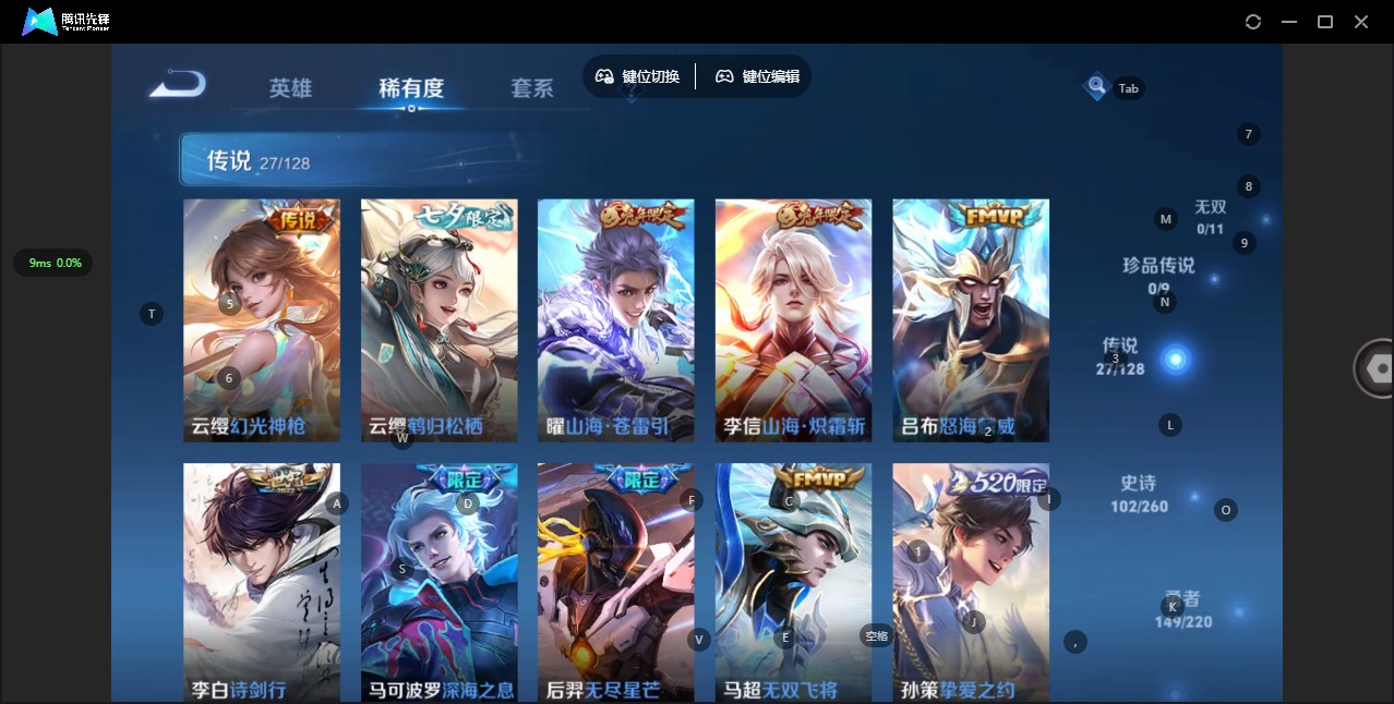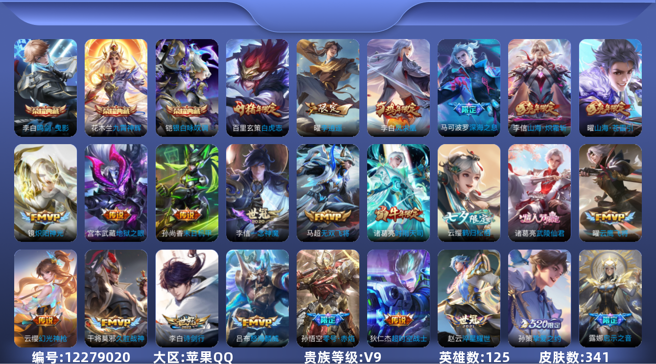 [12279020]V9 3典藏 27传说 125英雄 341皮肤 可修改实名 优质装备:鸣剑·曳影,九霄神辉(木兰典藏),银白咏叹调(倪克斯侍卫),云鹰飞将(小将军),久胜战神,炽阳神光,一念神魔,末日机甲-孙尚香(绿蚂蚱),地狱火,零号·赤焰,地狱之眼,李逍遥,淬星耀世,超时空战士-狄仁杰,挚爱之约,无双飞将,山海·炽霜斩(李信年限),山海·苍雷引(电光曜子),鹤归松栖(云缨) 传说皮:幻光神枪 珍宝阁皮:妄想食味,优雅恋人,女武神 限定皮:逐霄战戟,至尊宝,白虎志(电光耗子),凤求凰(白切鸡),武陵仙君(小桃花),傲雪梅枪,时雨天司(水龙头),神威(电光马子),瑞麟志(木兰年限),遇见飞天,诗剑行,怒海麟威,五谷丰年,天狼运算者,游园惊梦,梁祝,天狼狩猎者,龙胆,天狼溯光者,李小龙,逐梦之影,朱雀志(守约年限),如梦令-后羿,霸王别姬-虞姬,孙行者,大圣娶亲,寅虎·御盾(廉颇年限),寅虎·心曲(虎婆),百木心枪,玉兔公主,启示之音,无尽星芒,深海之息(深海大菠萝),唐三藏,山海·玄木吟(马可年限) 史诗皮:化蝶舞,石田雨龙,百相守梦-周瑜,百相守梦-百里守约,苍穹之光,电玩小子(小书包),黄金分割率,千年之狐,永昼,江河有灵,末日机甲-莱西奥,鹤归松栖(赵怀真),魅语,冰冠公主,偶像歌手,百相守梦(关羽),末日机甲-吕布,猫狗日记-孙策,猫狗日记-大乔,乱世虎臣,修罗,女仆咖啡,摇滚巨星,水果甜心,绅士熊喵,天才门将,星夜王子,心灵骇客,功夫厨神,德古拉伯爵,暗隐猎兽者,幽灵船长,鬼剑武藏,暗渊魔法,心灵战警,舞动绿茵,地狱岩魂,纤云弄巧,繁星吟游(呼啦呼啦),缤纷独角兽,乘风破浪,逐浪之夏,月团寄思,水晶猎龙者,曙光守护者,热力回旋,箭羽风息,唤灵魅影,金属风暴,原初追逐者,圣诞狂欢,圣诞恋歌,鹰眼统帅,王者之锤,魅力维加斯,黎明之约,赏金猎手,奇遇舞章,滕王阁序,寅虎·御盾,未来纪元-赵云