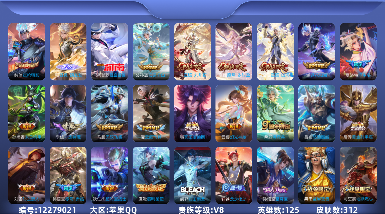 [12279021]V8 1典藏 1无双 1珍品传说 19传说 125英雄 312皮肤 可修改实名 优质装备:弑枪猎影(韩信典藏),器灵·螭龙剑,怪盗基德,黄金射手座,云鹰飞将(小将军),一念神魔,末日机甲-孙尚香(绿蚂蚱),零号·赤焰,时之恋人-刘备(电焊工),超时空战士-狄仁杰,无双飞将,浮生妄,澜逐花归海 传说皮:云诺千山,铠冥王哈迪斯,幻光神枪 珍宝阁皮:妄想食味,女武神 限定皮:愿照·九州拓(澜年限),愿照·岁时盈(虞姬年限),愿照·山河定(司空震年限),逐霄战戟,鸣野蒿,至尊宝,遇见飞天,怒海麟威,五谷丰年,梁祝,天狼绘梦者,李小龙,朱雀志(守约年限),如梦令-后羿 史诗皮:狼魂孤将,化蝶舞,星界战将,谪仙醉月,龙之律动,石田雨龙,茶境仙,破空之剑,百相守梦-百里守约,星界特工,紫霞仙子,苍穹之光,黄金分割率,特工魅影,千年之狐,江河有灵,高渐离燃音魔法,冰冠公主,偶像歌手,暗夜猫娘,末日机甲-吕布,猫狗日记-孙策,乱世虎臣,节奏热浪,修罗,女仆咖啡,摇滚巨星,水果甜心,绅士熊喵,天才门将,星夜王子,心灵骇客,功夫厨神,德古拉伯爵,暗隐猎兽者,幽灵船长,鬼剑武藏,心灵战警,地狱岩魂,纤云弄巧,拒霜思,缤纷独角兽,乘风破浪,逐浪之夏,水晶猎龙者,曙光守护者,箭羽风息,唤灵魅影,金属风暴,圣诞狂欢,圣诞恋歌,鹰眼统帅,暗夜贵公子,魅力维加斯,黎明之约,雪上飞焰,奇遇舞章,无心,未来纪元-赵云
