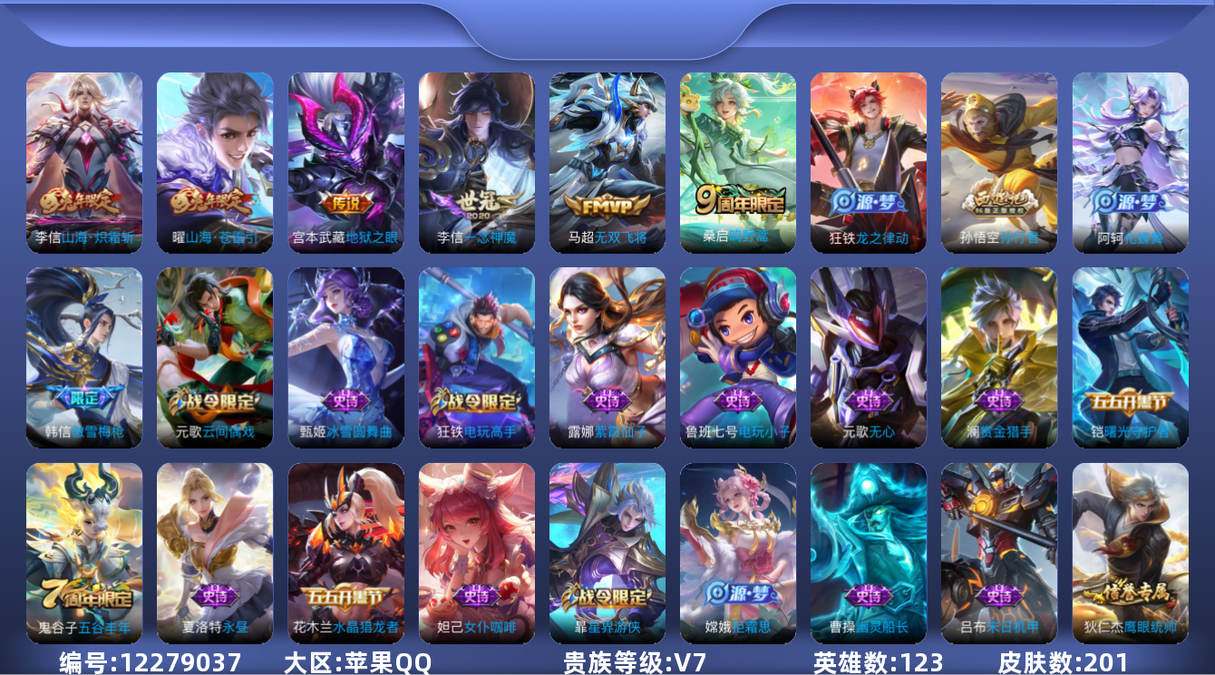 [12279037]V7 6传说 123英雄 201皮肤 可修改实名 优质装备:一念神魔,地狱之眼,无双飞将,山海·炽霜斩(李信年限),山海·苍雷引(电光曜子) 珍宝阁皮:胡桃夹子,玩趣恶龙 限定皮:鸣野蒿,傲雪梅枪,匿光决锋者,五谷丰年,孙行者 史诗皮:化蝶舞,龙之律动,紫霞仙子,电玩小子(小书包),永昼,百解令(蒙犽),高渐离燃音魔法,冰冠公主,偶像歌手,末日机甲-吕布,猫狗日记-孙策,节奏热浪,女仆咖啡,摇滚巨星,水果甜心,星夜王子,功夫厨神,暗隐猎兽者,幽灵船长,鬼剑武藏,心灵战警,舞动绿茵,地狱岩魂,拒霜思,缤纷独角兽,乘风破浪,逐浪之夏,水晶猎龙者,曙光守护者,箭羽风息,金属风暴,圣诞狂欢,鹰眼统帅,暗夜贵公子,魅力维加斯,黎明之约,赏金猎手,无心