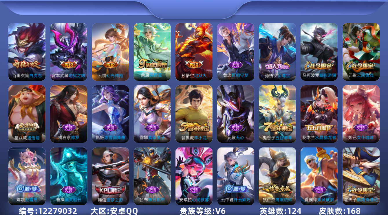 [12279032]V6 5传说 124英雄 168皮肤 可修改实名 优质装备:地狱火,地狱之眼 传说皮:幻光神枪 珍宝阁皮:优雅恋人,女武神 限定皮:逐霄战戟,鸣野蒿,至尊宝,白虎志(电光耗子),高山流水,五谷丰年,梁祝,李小龙,逐梦之影,猪悟能 史诗皮:蒙犽顽岩魄,百相守梦-黄忠,紫霞仙子,黄金分割率,特工魅影,江河有灵,百解令(蒙犽),龙骑士(小龙虾),末日机甲-吕布,节奏热浪,修罗,女仆咖啡,水果甜心,星夜王子,心灵骇客,德古拉伯爵,幽灵船长,鬼剑武藏,心灵战警,地狱岩魂,纤云弄巧,拒霜思,乘风破浪,水晶猎龙者,金属风暴,鹰眼统帅,魅力维加斯,无心,未来纪元-赵云