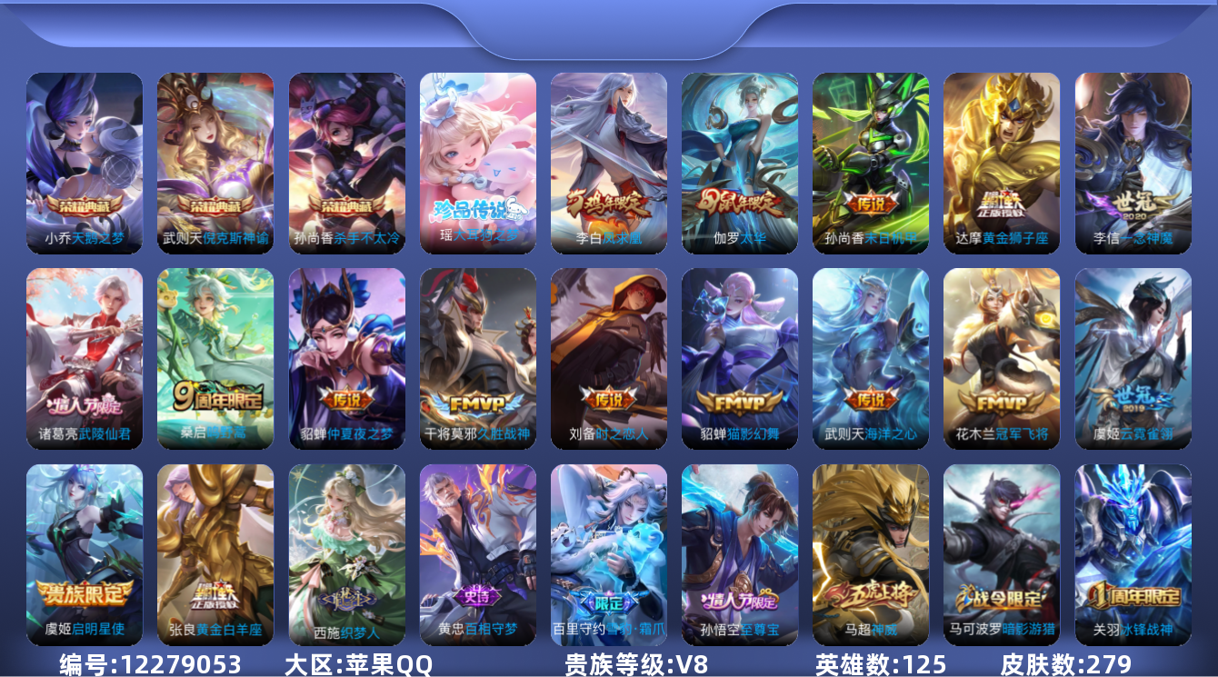 [12279053]V8 3典藏 1珍品传说 16传说 125英雄 279皮肤 典藏英雄武则天 可修改实名 优质装备:天鹅之梦(小乔典藏),倪克斯神谕(宇宙婆娘),杀手不太冷,大耳狗之梦,黄金狮子座,冠军飞将,黄金白羊座,猫影幻舞,久胜战神,一念神魔,云霓雀翎,末日机甲-孙尚香(绿蚂蚱),仲夏夜之梦(大飞蛾),海洋之心,时之恋人-刘备(电焊工) 珍宝阁皮:妄想食味,玩趣恶龙 限定皮:鸣野蒿,至尊宝,凤求凰(白切鸡),太华(伽罗年限),武陵仙君(小桃花),时之彼端,魔法小厨娘,神威(电光马子),玄嵩(庄周年限),五谷丰年,冰锋战神,幽恒(沐浴露),梁祝,龙胆,烈魂,虎魄,天狼绘梦者,李小龙,辉光之辰,如梦令-嫦娥,如梦令-后羿 史诗皮:雪豹·霜爪,破空之剑,百相守梦-百里守约,百相守梦-黄忠,织梦人,遇见神鹿,紫霞仙子,苍穹之光,电玩小子(小书包),黄金分割率,特工魅影,千年之狐,魅语,无限星赏官,冰冠公主,白蛇,晚萤,末日机甲-吕布,猫狗日记-大乔,时之恋人-孙尚香,乱世虎臣,节奏热浪,修罗,女仆咖啡,摇滚巨星,水果甜心,绅士熊喵,天才门将,心灵骇客,功夫厨神,鬼剑武藏,舞动绿茵,地狱岩魂,诗语江南,繁星吟游(呼啦呼啦),缤纷独角兽,乘风破浪,逐浪之夏,水晶猎龙者,曙光守护者,箭羽风息,金属风暴,原初追逐者,圣诞狂欢,圣诞恋歌,鹰眼统帅,暗夜贵公子,魅力维加斯,黎明之约