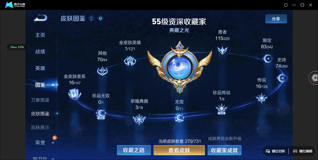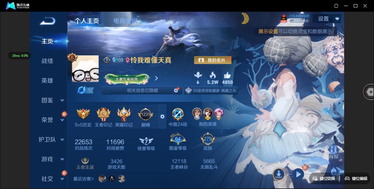 - PX_2084781-实名: 可修改 贵族等级: V6 英雄数: 96 皮肤数: 75 星传说: 金色仲夏夜 限定皮: 至美·乘鲤谣,鸣野蒿