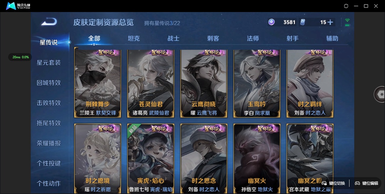 黄忠烈魂,甄姬幽恒,伽罗太华,张飞虎魄,赵云龙胆,后羿如梦令,后羿辉光之辰,庄周玄嵩,裴擒虎李小龙,上官婉儿梁祝,上官婉儿天狼绘梦者,安琪拉魔法小厨娘,桑启鸣野蒿,孙悟空至尊宝,马超神威,妲己时之彼端,嫦娥如梦令,关羽冰锋战神