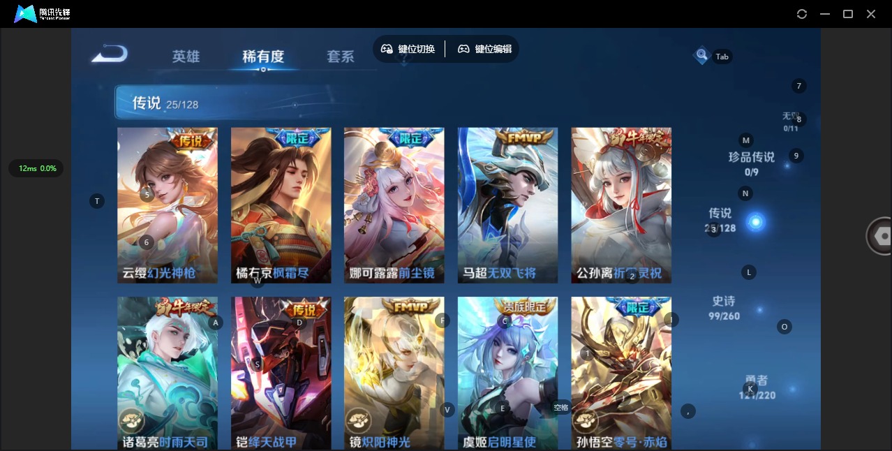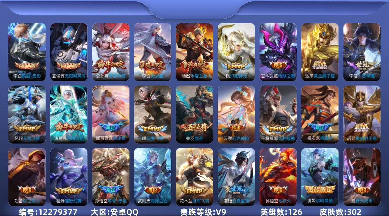 - [12297244]V8 2典藏 1无双 1珍品传说 11传说 126英雄 241皮肤 可修改实名 优质装备:九霄神辉(木兰典藏),弑枪猎影(韩信典藏),器灵·螭龙剑,怪盗基德,黄金射手座,久胜战神,仲夏夜之梦(大飞蛾),李逍遥,时之恋人-刘备(电焊工),澜逐花归海,涂山容容 传说皮:乘龙·淬吴钩(孙策年限),幻光神枪 珍宝阁皮:优雅恋人,蔷薇恋人,女武神 限定皮:鸣野蒿,至尊宝,凤凰于飞,神威(电光马子),遇见飞天,诗剑行,李小龙,孙行者,大圣娶亲,百木心枪 史诗皮:化蝶舞,雪豹·霜爪,龙之律动,茶境仙,百相守梦-周瑜,蒙犽顽岩魄,谪仙醉月,破空之剑,蔬乡物语(鲁班七号),星界战将,织梦人,苍穹之光,电玩小子(小书包),白龙吟,黄金分割率,特工魅影,江河有灵,龙骑士(小龙虾),百解令(蒙犽),高渐离燃音魔法,魅语,冰冠公主,偶像歌手,末日机甲-吕布,猫狗日记-孙策,乱世虎臣,修罗,女仆咖啡,摇滚巨星,水果甜心,绅士熊喵,星夜王子,心灵骇客,功夫厨神,德古拉伯爵,暗隐猎兽者,幽灵船长,鬼剑武藏,舞动绿茵,地狱岩魂,诗语江南,纤云弄巧,拒霜思,缤纷独角兽,逐浪之夏,月团寄思,水晶猎龙者,曙光守护者,箭羽风息,金属风暴,鹰眼统帅,暗夜贵公子,魅力维加斯,赏金猎手,未来纪元-赵云